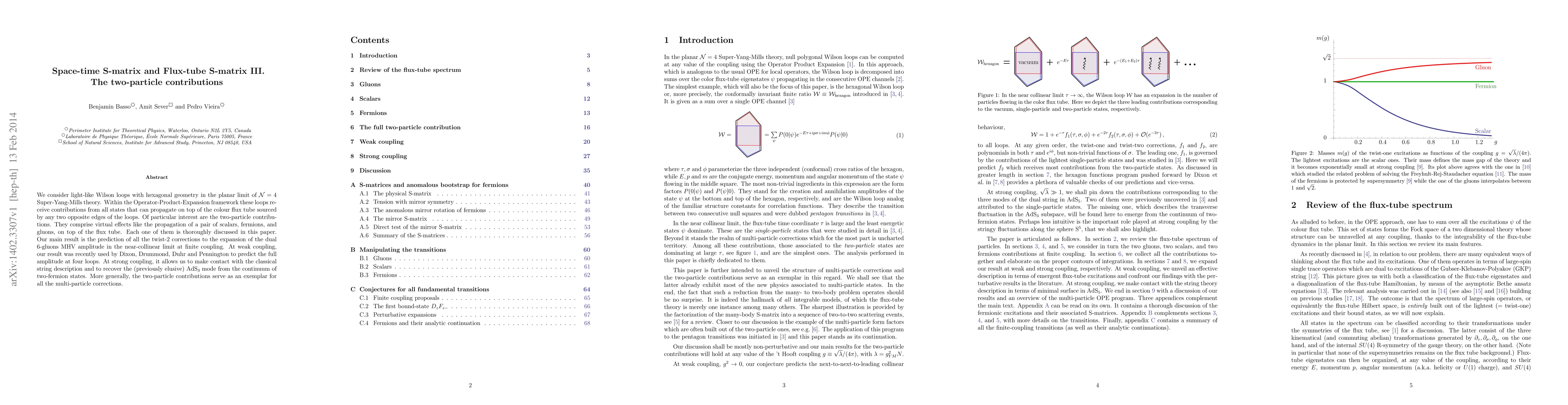 We consider light-like Wilson loops with hexagonal geometry in the planar limit of N=4 Super-Yang-Mills theory. Within the Operator-Product-Expansion framework these loops receive contributions from all states that can propagate on top of the colour flux tube sourced by any two opposite edges of the loops. Of particular interest are the two-particle contributions. They comprise virtual effects like the propagation of a pair of scalars, fermions, and gluons, on top of the flux tube. Each one of them is thoroughly discussed in this paper. Our main result is the prediction of all the twist-2 corrections to the expansion of the dual 6-gluons MHV amplitude in the near-collinear limit at finite coupling. At weak coupling, our result was recently used by Dixon, Drummond, Duhr and Pennington to predict the full amplitude at four loops. At strong coupling, it allows us to make contact with the classical string description and to recover the (previously elusive) AdS(3) mode from the continuum of two-fermion states. More generally, the two-particle contributions serve as an exemplar for all the multi-particle corrections.
