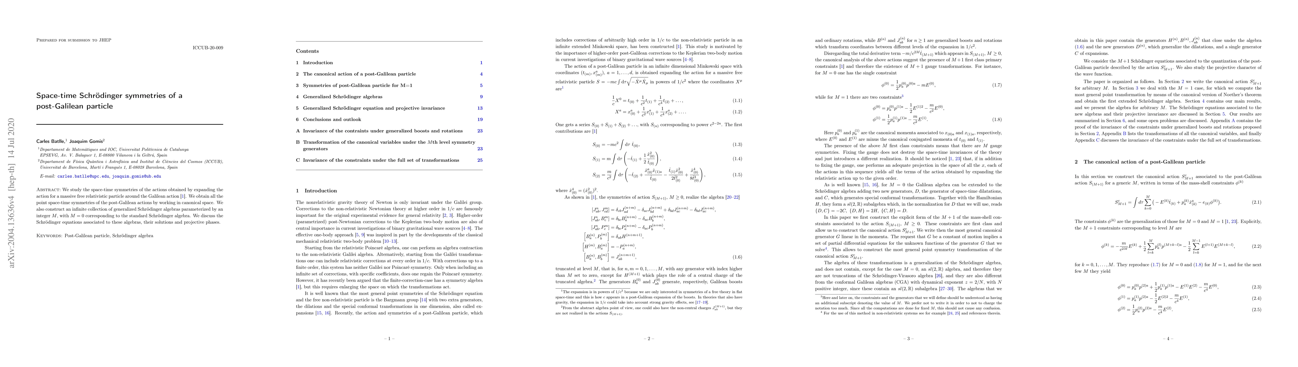 We study the space-time symmetries of the actions obtained by expanding the action for a massive free relativistic particle around the Galilean action. We obtain all the point space-time symmetries of the post-Galilean actions by working in canonical space. We also construct an infinite collection of generalized Schr\"odinger algebras parameterized by an integer $M$, with $M=0$ corresponding to the standard Schr\"odinger algebra. We discuss the Schr\"odinger equations associated to these algebras, their solutions and projective phases.