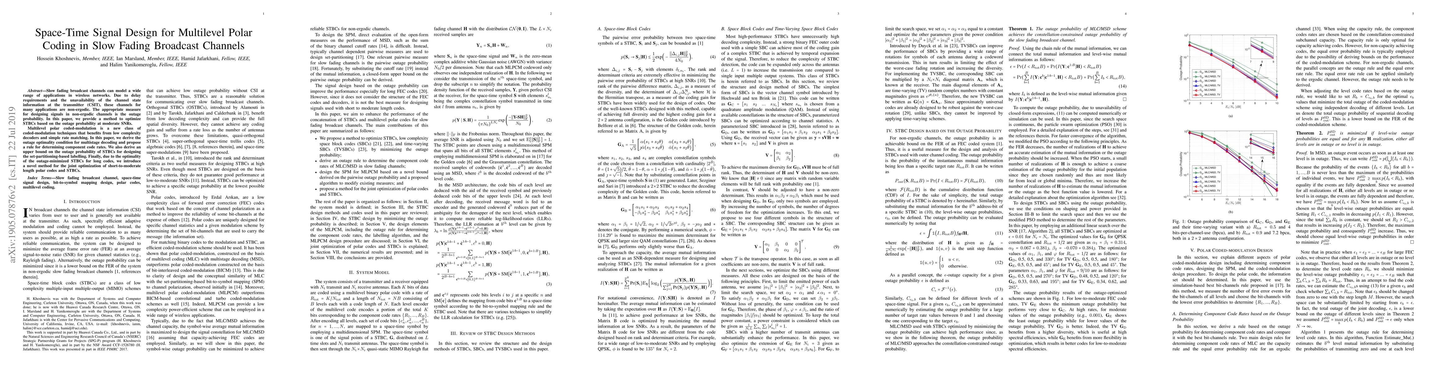 Slow fading broadcast channels can model a wide range of applications in wireless networks. Due to delay requirements and the unavailability of the channel state information at the transmitter (CSIT), these channels for many applications are non-ergodic. The appropriate measure for designing signals in non-ergodic channels is the outage probability. In this paper, we provide a method to optimize STBCs based on the outage probability at moderate SNRs. Multilevel polar coded-modulation is a new class of coded-modulation techniques that benefits from low complexity decoders and simple rate matching. In this paper, we derive the outage optimality condition for multistage decoding and propose a rule for determining component code rates. We also derive an upper bound on the outage probability of STBCs for designing the set-partitioning-based labelling. Finally, due to the optimality of the outage-minimized STBCs for long codes, we introduce a novel method for the joint optimization of short-to-moderate length polar codes and STBCs.