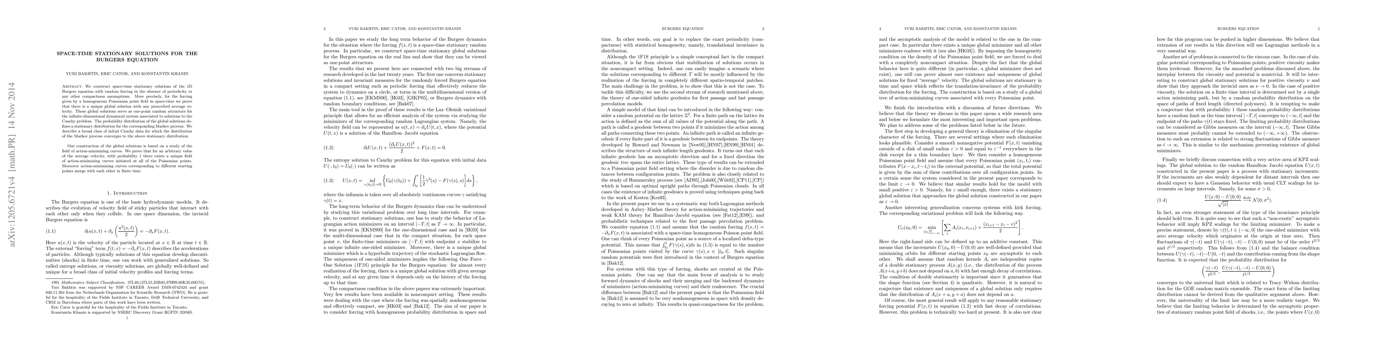 We construct space-time stationary solutions of the 1D Burgers equation with random forcing in the absence of periodicity or any other compactness assumptions. More precisely, for the forcing given by a homogeneous Poissonian point field in space-time we prove that there is a unique global solution with any prescribed average velocity. These global solutions serve as one-point random attractors for the infinite-dimensional dynamical system associated to solutions to the Cauchy problem. The probability distribution of the global solutions defines a stationary distribution for the corresponding Markov process. We describe a broad class of initial Cauchy data for which the distribution of the Markov process converges to the above stationary distribution. Our construction of the global solutions is based on a study of the field of action-minimizing curves. We prove that for an arbitrary value of the average velocity, with probability 1 there exists a unique field of action-minimizing curves initiated at all of the Poissonian points. Moreover action-minimizing curves corresponding to different starting points merge with each other in finite time.