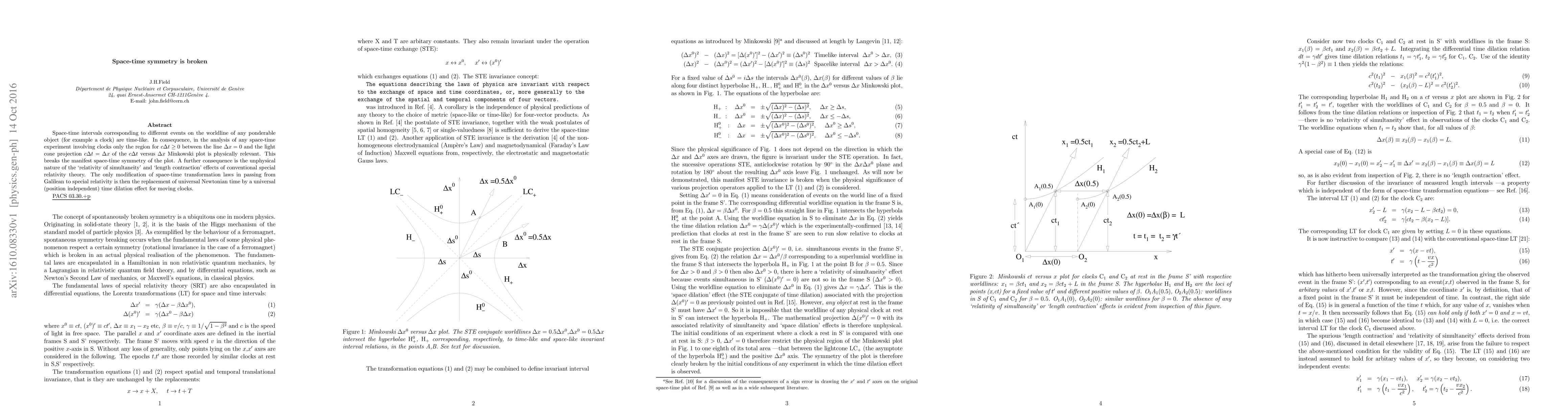 Space-time intervals corresponding to different events on the worldline of any ponderable object (for example a clock) are time-like. In consequence, in the analysis of any space-time experiment involving clocks only the region for $c\Delta t \ge 0$ between the line $\Delta x = 0$ and the light cone projection $c\Delta t = \Delta x$ of the $c\Delta t$ versus $\Delta x$ Minkowski plot is physically relevant. This breaks the manifest space-time symmetry of the plot. A further consequence is the unphysical nature of the `relativity of simultaneity' and `length contraction' effects of conventional special relativity theory. The only modification of space-time transformation laws in passing from Galilean to special relativity is then the replacement of universal Newtonian time by a universal (position independent) time dilation effect for moving clocks.