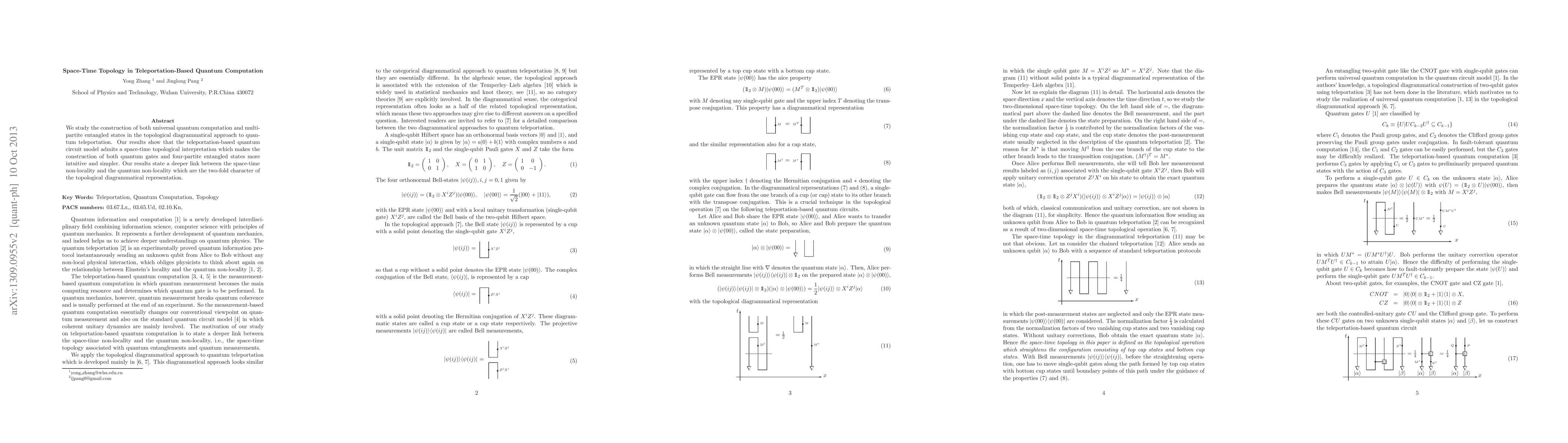 This paper explores how quantum teleportation can be used to construct universal quantum computation and multi-partite entangled states through a topological diagrammatical approach. The findings reveal a space-time topological interpretation that simplifies the construction of quantum gates and four-partite entangled states, highlighting a deeper connection between space-time and quantum non-locality.