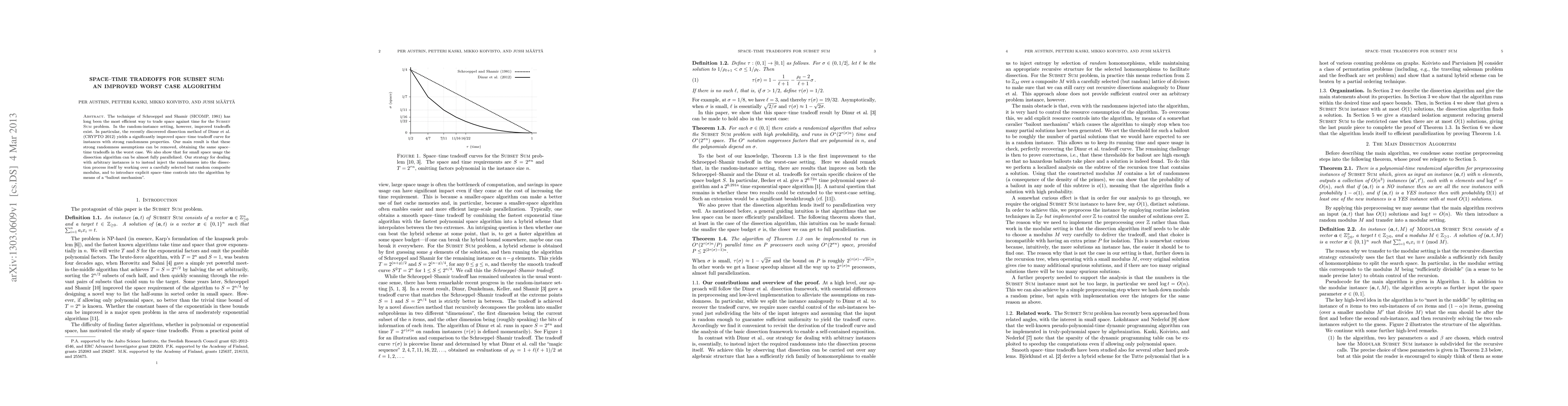 This paper improves the space-time tradeoffs for the SUBSET SUM problem by removing strong randomness assumptions, allowing the dissection method to work in the worst case. It also demonstrates near-full parallelization for small space usage and introduces a random composite modulus and bailout mechanism to handle arbitrary instances.