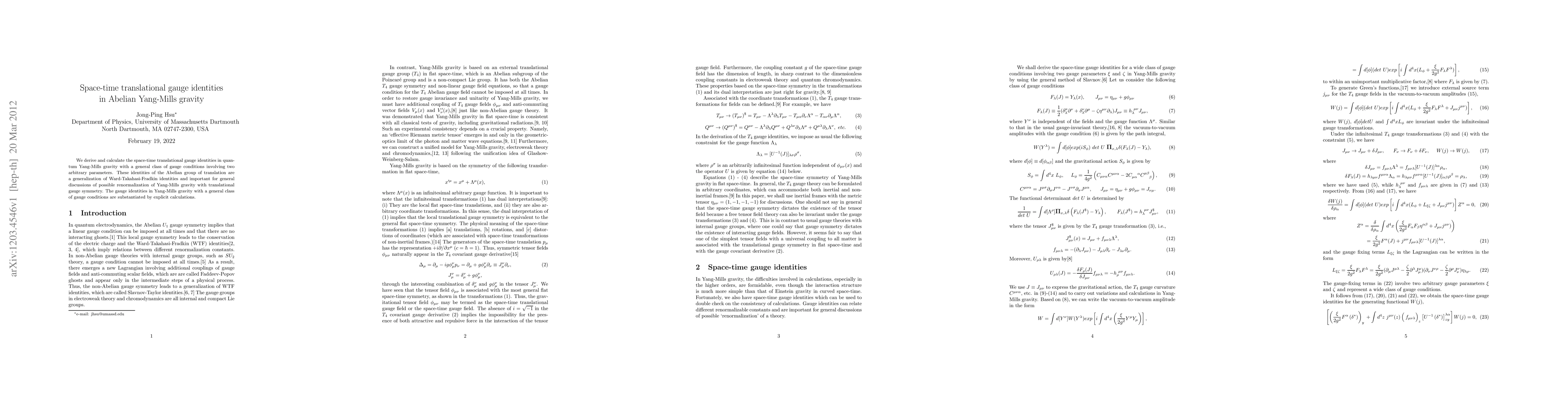 This paper derives space-time translational gauge identities for quantum Yang-Mills gravity under general gauge conditions, generalizing Ward-Takahashi-Fradkin identities and providing insights into renormalization with translational symmetry. Explicit calculations substantiate these gauge identities.