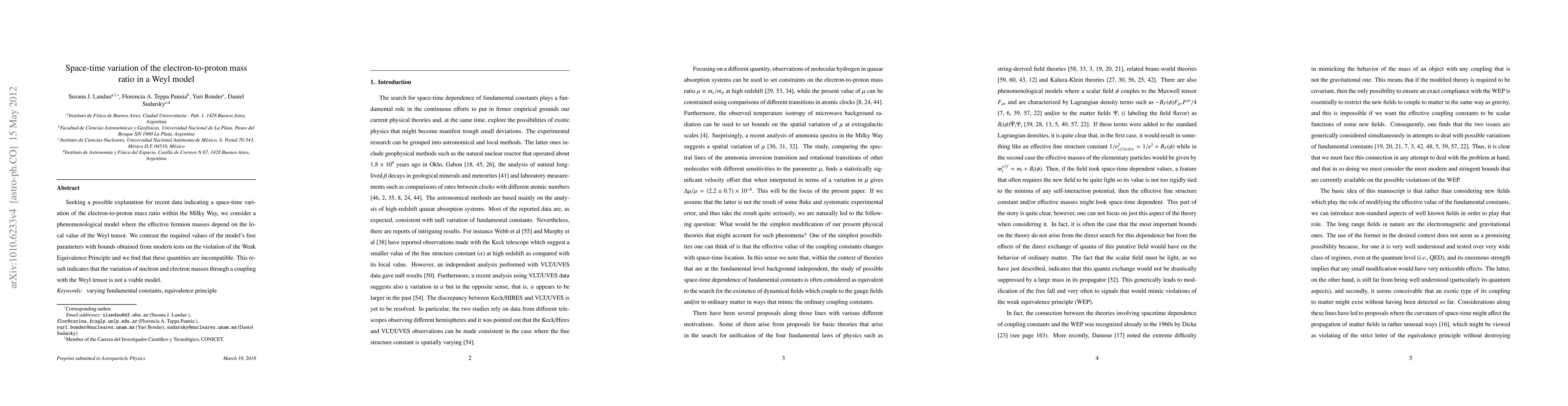 This paper investigates a Weyl model explaining space-time variation in the electron-to-proton mass ratio, but finds that the model's parameters are incompatible with current tests on the Weak Equivalence Principle, concluding that the proposed coupling with the Weyl tensor is not feasible.