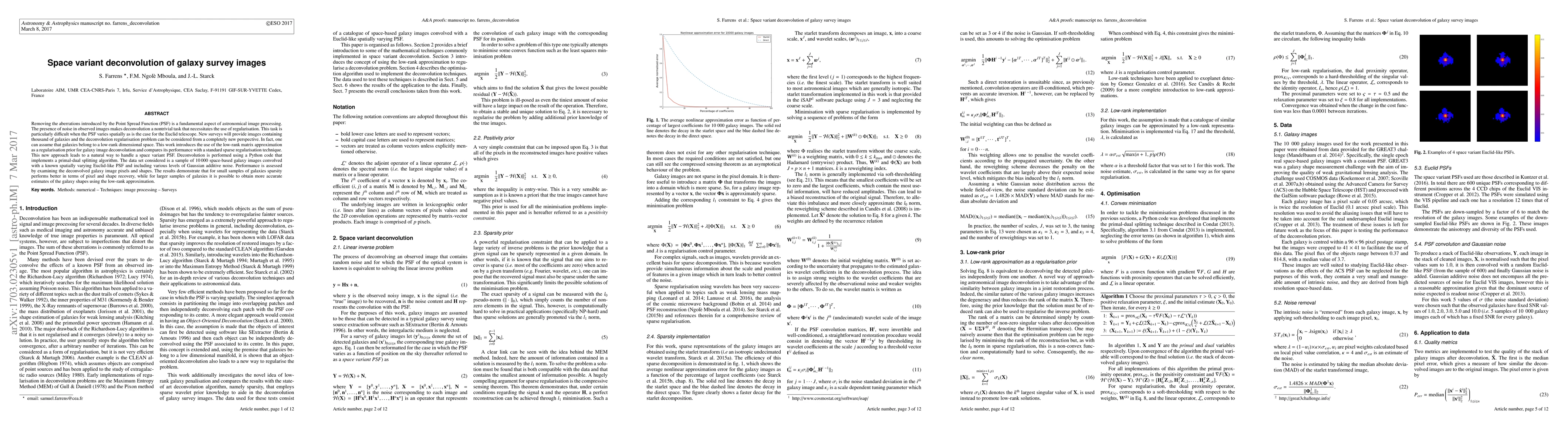 This paper proposes a low-rank matrix approximation as a regularization method for deconvolving galaxy images affected by a spatially varying Point Spread Function, comparing it to sparse regularization. The results show that while sparse regularization is better for small galaxy samples, low-rank approximation performs better for larger samples in terms of shape recovery.