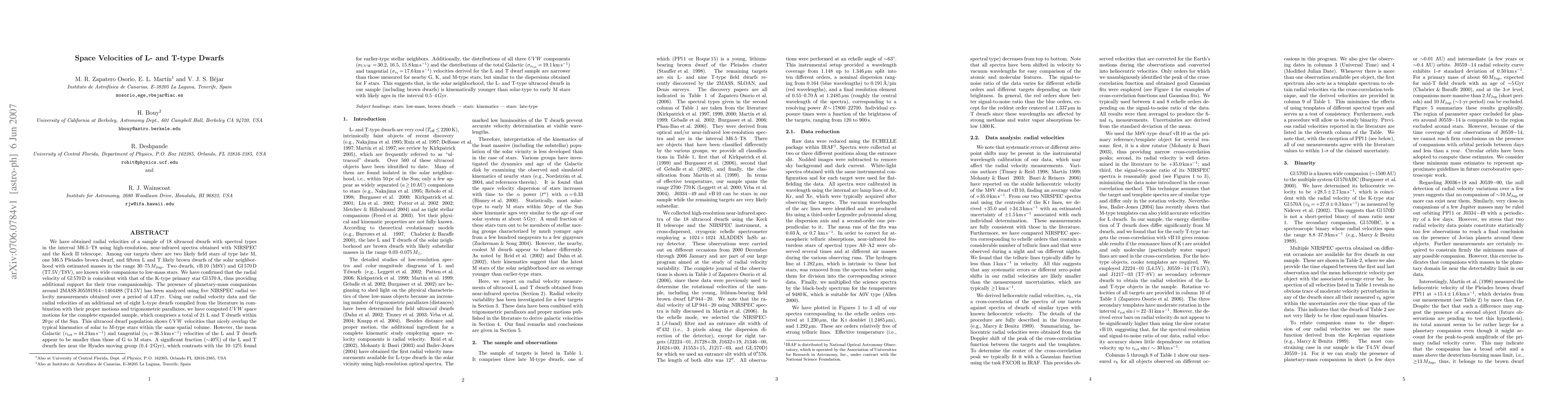 (Abridged) We have obtained radial velocities of a sample of 18 ultracool dwarfs (M6.5-T8) using high-resolution, near-infrared spectra obtained with NIRSPEC and the Keck II telescope. We have confirmed that the radial velocity of Gl 570 D is coincident with that of the K-type primary star Gl 570 A, thus providing additional support for their true companionship. The presence of planetary-mass companions around 2MASS J05591914-1404488 (T4.5V) has been analyzed using five NIRSPEC radial velocity measurements obtained over a period of 4.37 yr. We have computed UVW space motions for a total of 21 L and T dwarfs within 20 pc of the Sun. This population shows UVW velocities that nicely overlap the typical kinematics of solar to M-type stars within the same spatial volume. However, the mean Galactic (44.2 km/s) and tangential (36.5 km/s) velocities of the L and T dwarfs appear to be smaller than those of G to M stars. A significant fraction (~40%) of the L and T dwarfs lies near the Hyades moving group (0.4-2 Gyr), which contrasts with the 10-12% found for earlier-type stellar neighbors. Additionally, the distributions of all three UVW components (sigma_{UVW} = 30.2, 16.5, 15.8 km/s) and the distributions of the total Galactic (sigma_{v_tot} = 19.1 km/s) and tangential (sigma_{v_t} = 17.6 km/s) velocities derived for the L and T dwarf sample are narrower than those measured for nearby G, K, and M-type stars, but similar to the dispersions obtained for F stars. This suggests that, in the solar neighborhood, the L- and T-type ultracool dwarfs in our sample (including brown dwarfs) is kinematically younger than solar-type to early M stars with likely ages in the interval 0.5-4 Gyr.