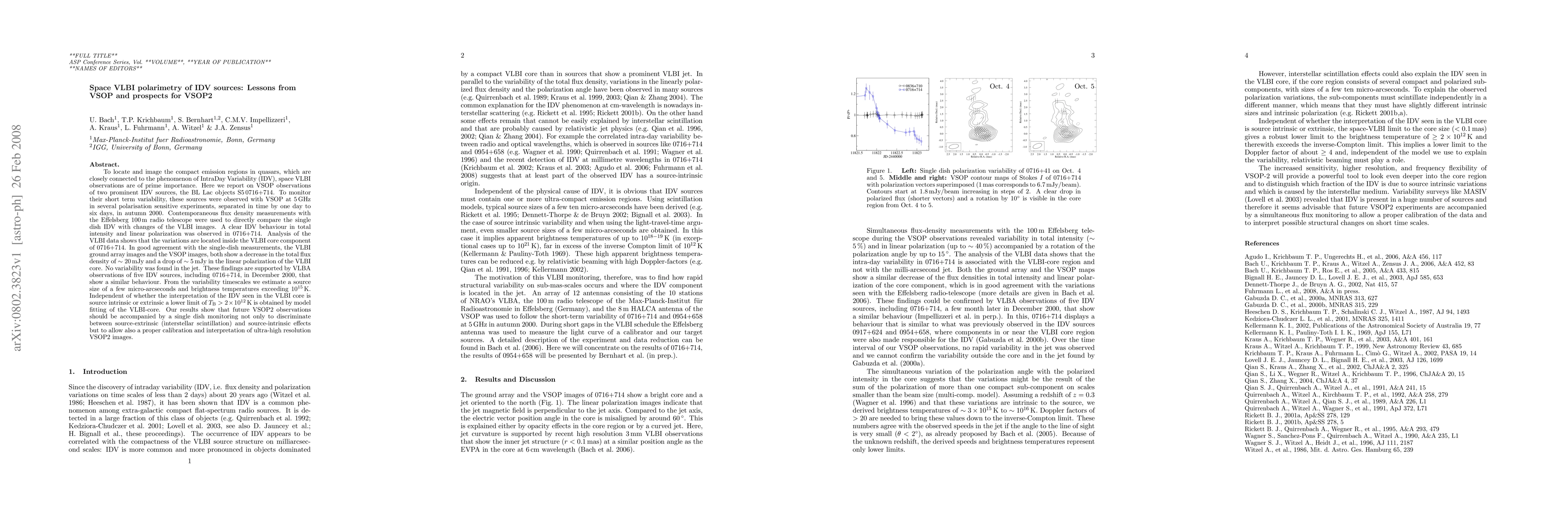 The paper presents VSOP space VLBI observations of IDV sources, specifically the BL Lac object S5 0716+714, revealing IDV in total intensity and linear polarization within the VLBI core. The findings suggest a source size of a few micro-arcseconds and brightness temperatures exceeding 10^15 K. The study emphasizes the importance of single-dish monitoring for future VSOP2 observations to distinguish between source-extrinsic and intrinsic effects and ensure proper calibration and interpretation of high-resolution images.