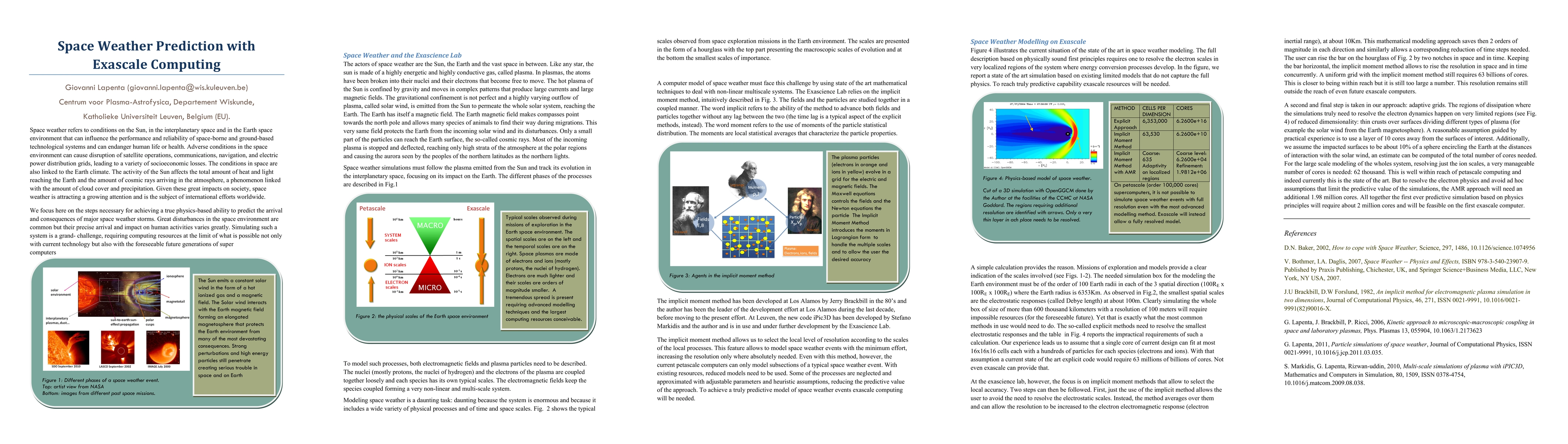 Space weather refers to conditions on the Sun, in the interplanetary space and in the Earth space environment that can influence the performance and reliability of space-borne and ground-based technological systems and can endanger human life or health. Adverse conditions in the space environment can cause disruption of satellite operations, communications, navigation, and electric power distribution grids, leading to a variety of socioeconomic losses. The conditions in space are also linked to the Earth climate. The activity of the Sun affects the total amount of heat and light reaching the Earth and the amount of cosmic rays arriving in the atmosphere, a phenomenon linked with the amount of cloud cover and precipitation. Given these great impacts on society, space weather is attracting a growing attention and is the subject of international efforts worldwide. We focus here on the steps necessary for achieving a true physics-based ability to predict the arrival and consequences of major space weather storms. Great disturbances in the space environment are common but their precise arrival and impact on human activities varies greatly. Simulating such a system is a grand- challenge, requiring computing resources at the limit of what is possible not only with current technology but also with the foreseeable future generations of super computers