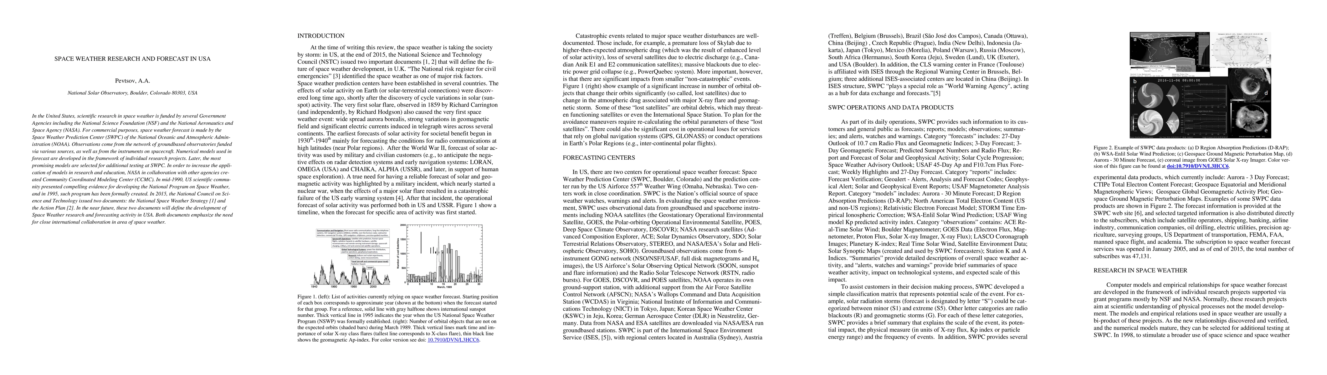 In the United States, scientific research in space weather is funded by several Government Agencies including the National Science Foundation (NSF) and the National Aeronautics and Space Agency (NASA). For commercial purposes, space weather forecast is made by the Space Weather Prediction Center (SWPC) of the National Oceanic and Atmospheric Administration (NOAA). Observations come from the network of groundbased observatories funded via various sources, as well as from the instruments on spacecraft. Numerical models used in forecast are developed in the framework of individual research projects. Later, the most promising models are selected for additional testing at SWPC. In order to increase the application of models in research and education, NASA in collaboration with other agencies created Community Coordinated Modeling Center (CCMC). In mid-1990, US scientific community presented compelling evidence for developing the National Program on Space Weather, and in 1995, such program has been formally created. In 2015, the National Council on Science and Technology issued two documents: the National Space Weather Strategy [1] and the Action Plan [2]. In the near future, these two documents will define the development of Space Weather research and forecasting activity in USA. Both documents emphasize the need for close international collaboration in area of space weather.