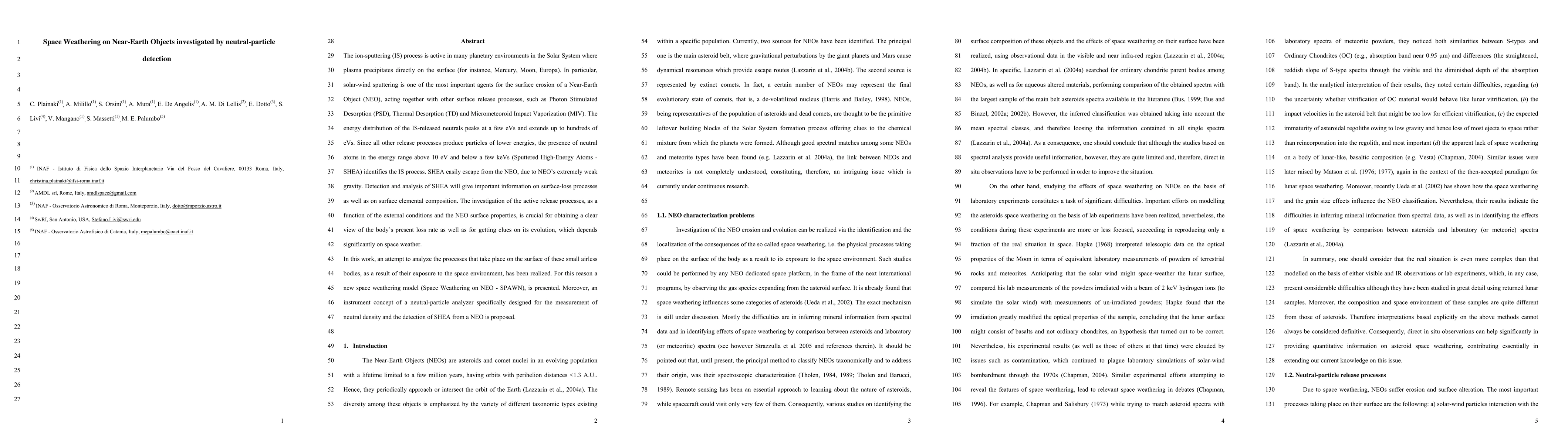 The ion-sputtering (IS) process is active in many planetary environments in the Solar System where plasma precipitates directly on the surface (for instance, Mercury, Moon, Europa). In particular, solar-wind sputtering is one of the most important agents for the surface erosion of a Near-Earth Object (NEO), acting together with other surface release processes, such as Photon Stimulated Desorption (PSD), Thermal Desorption (TD) and Micrometeoroid Impact Vaporization (MIV). The energy distribution of the IS-released neutrals peaks at a few eVs and extends up to hundreds of eVs. Since all other release processes produce particles of lower energies, the presence of neutral atoms in the energy range above 10 eV and below a few keVs (Sputtered High-Energy Atoms - SHEA) identifies the IS process. SHEA easily escape from the NEO, due to NEO's extremely weak gravity. Detection and analysis of SHEA will give important information on surface-loss processes as well as on surface elemental composition. The investigation of the active release processes, as a function of the external conditions and the NEO surface properties, is crucial for obtaining a clear view of the body's present loss rate as well as for getting clues on its evolution, which depends significantly on space weather. In this work, an attempt to analyze the processes that take place on the surface of these small airless bodies, as a result of their exposure to the space environment, has been realized. For this reason a new space weathering model (Space Weathering on NEO - SPAWN), is presented. Moreover, an instrument concept of a neutral-particle analyzer specifically designed for the measurement of neutral density and the detection of SHEA from a NEO is proposed