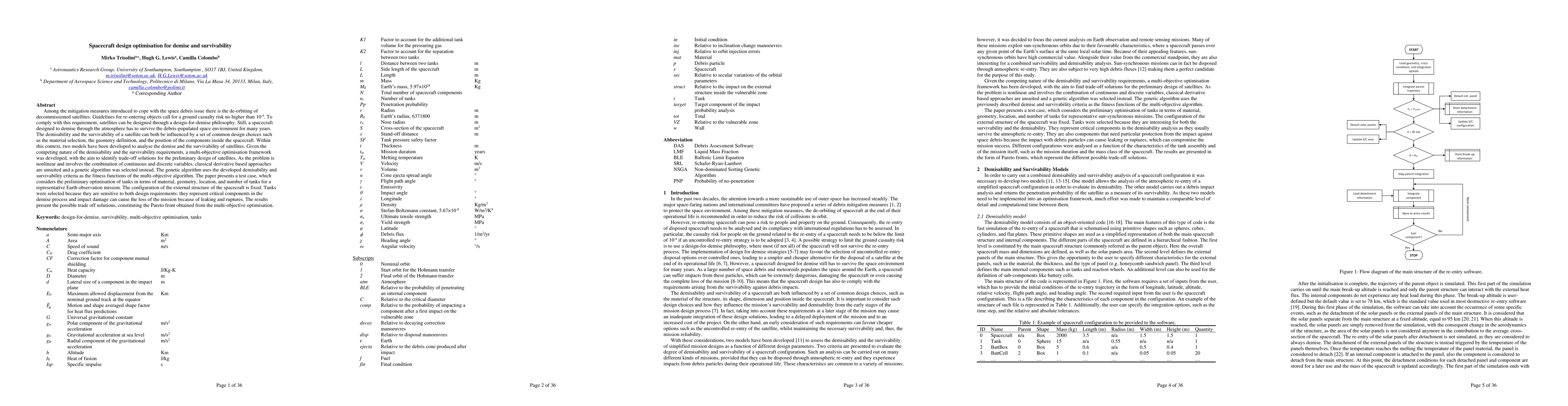 Among the mitigation measures introduced to cope with the space debris issue there is the de-orbiting of decommissioned satellites. Guidelines for re-entering objects call for a ground casualty risk no higher than 0.0001. To comply with this requirement, satellites can be designed through a design-for-demise philosophy. Still, a spacecraft designed to demise has to survive the debris-populated space environment for many years. The demisability and the survivability of a satellite can both be influenced by a set of common design choices such as the material selection, the geometry definition, and the position of the components. Within this context, two models have been developed to analyse the demise and the survivability of satellites. Given the competing nature of the demisability and the survivability, a multi-objective optimisation framework was developed, with the aim to identify trade-off solutions for the preliminary design of satellites. As the problem is nonlinear and involves the combination of continuous and discrete variables, classical derivative based approaches are unsuited and a genetic algorithm was selected instead. The genetic algorithm uses the developed demisability and survivability criteria as the fitness functions of the multi-objective algorithm. The paper presents a test case, which considers the preliminary optimisation of tanks in terms of material, geometry, location, and number of tanks for a representative Earth observation mission. The configuration of the external structure of the spacecraft is fixed. Tanks were selected because they are sensitive to both design requirements: they represent critical components in the demise process and impact damage can cause the loss of the mission because of leaking and ruptures. The results present the possible trade off solutions, constituting the Pareto front obtained from the multi-objective optimisation.