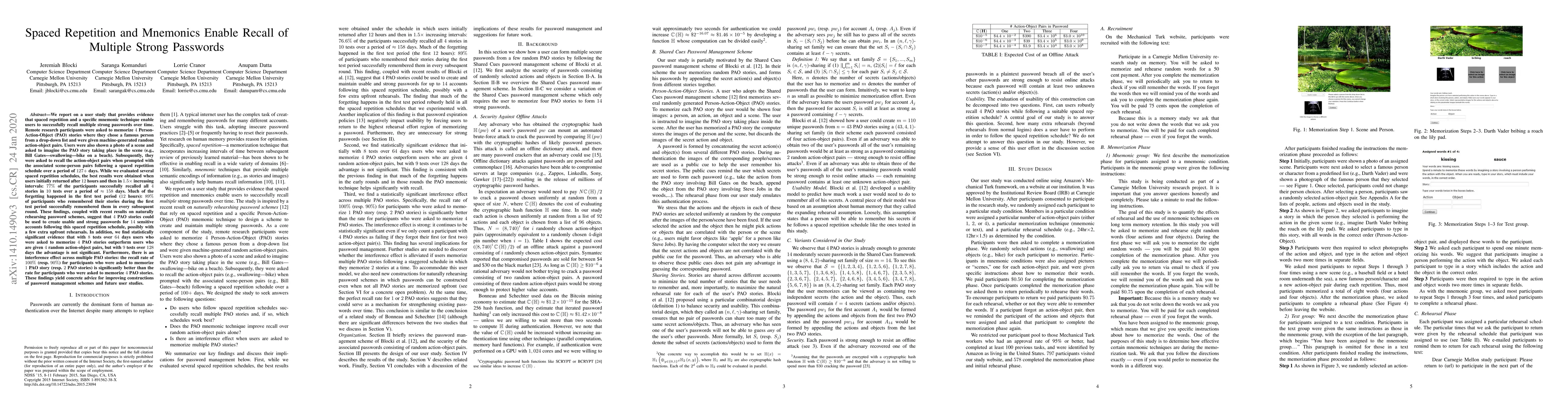 This study demonstrates that spaced repetition and mnemonic techniques, specifically Person-Action-Object (PAO) stories, enable users to recall multiple strong passwords over time. Participants successfully remembered 4 PAO stories over 158 days, with 77% recalling all stories in 10 tests, suggesting this method could support 14 accounts. However, recall diminishes with more stories, indicating interference effects.