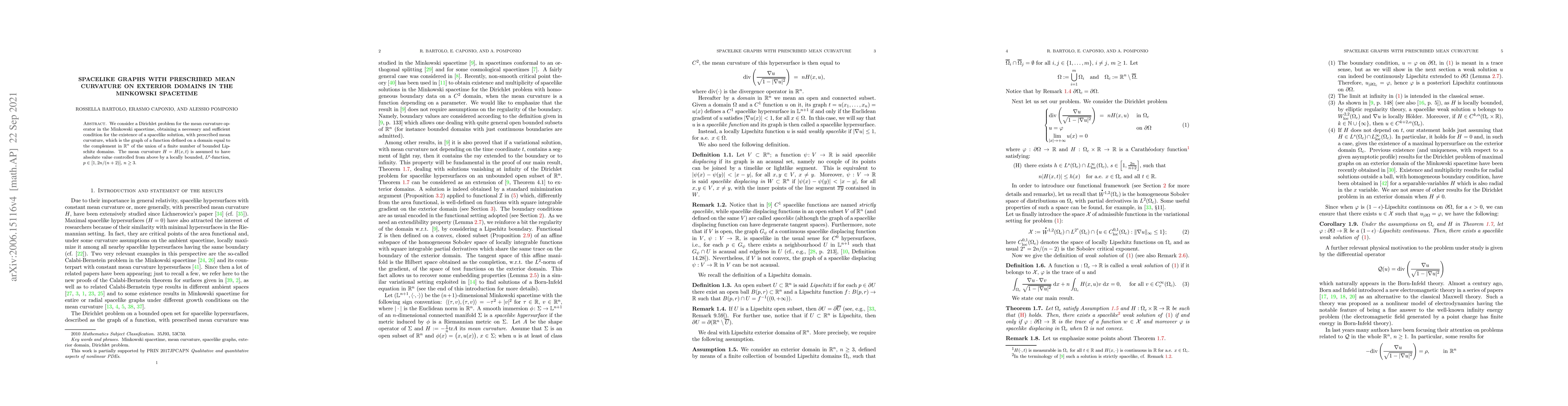 Two-line summary: This research addresses the Dirichlet problem for mean curvature in Minkowski spacetime, focusing on the existence of spacelike graphs with prescribed mean curvature. It establishes a necessary and sufficient condition for such graphs, which are defined on exterior domains excluding a finite number of bounded Lipschitz regions, under the assumption that the mean curvature is bounded by a locally controlled $L^p$ function.