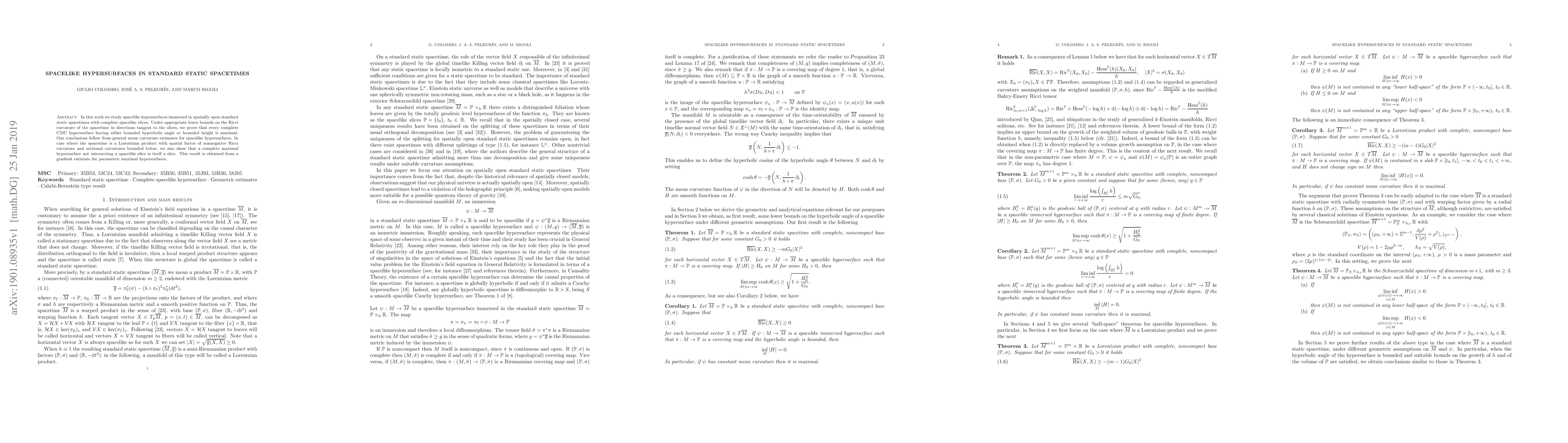 In this work we study spacelike hypersurfaces immersed in spatially open standard static spacetimes with complete spacelike slices. Under appropriate lower bounds on the Ricci curvature of the spacetime in directions tangent to the slices, we prove that every complete CMC hypersurface having either bounded hyperbolic angle or bounded height is maximal. Our conclusions follow from general mean curvature estimates for spacelike hypersurfaces. In case where the spacetime is a Lorentzian product with spatial factor of nonnegative Ricci curvature and sectional curvatures bounded below, we also show that a complete maximal hypersurface not intersecting a spacelike slice is itself a slice. This result is obtained from a gradient estimate for parametric maximal hypersurfaces.