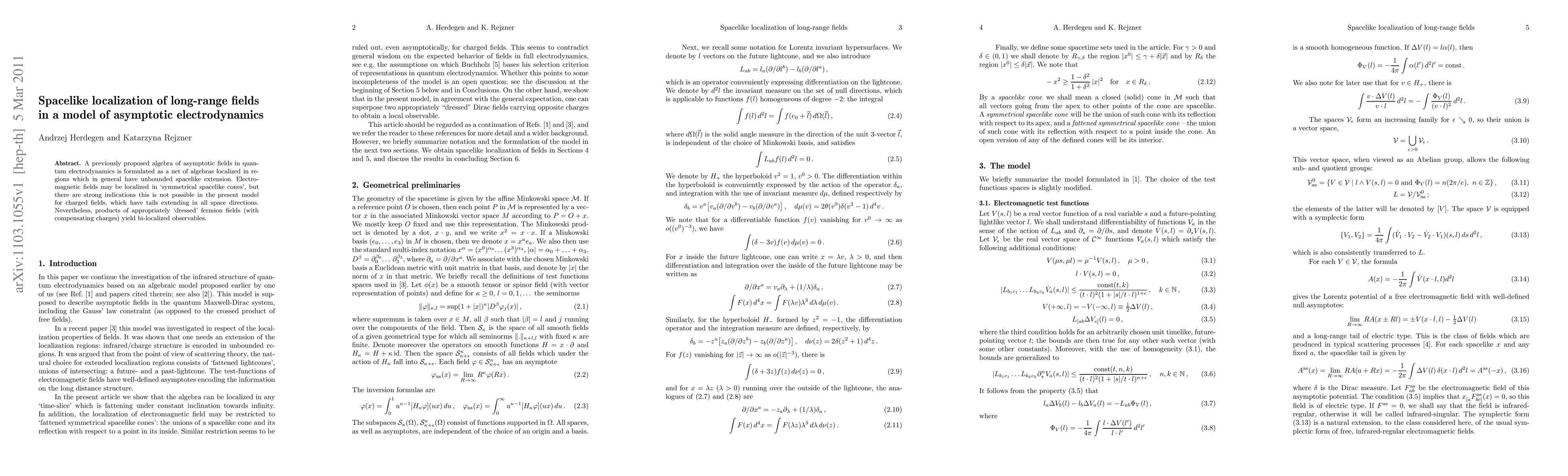 This paper explores a model of asymptotic electrodynamics where electromagnetic fields cannot be localized in symmetrical spacelike cones due to their long-range nature. However, it demonstrates that bi-localized observables can be obtained through products of dressed fermion fields with compensating charges.