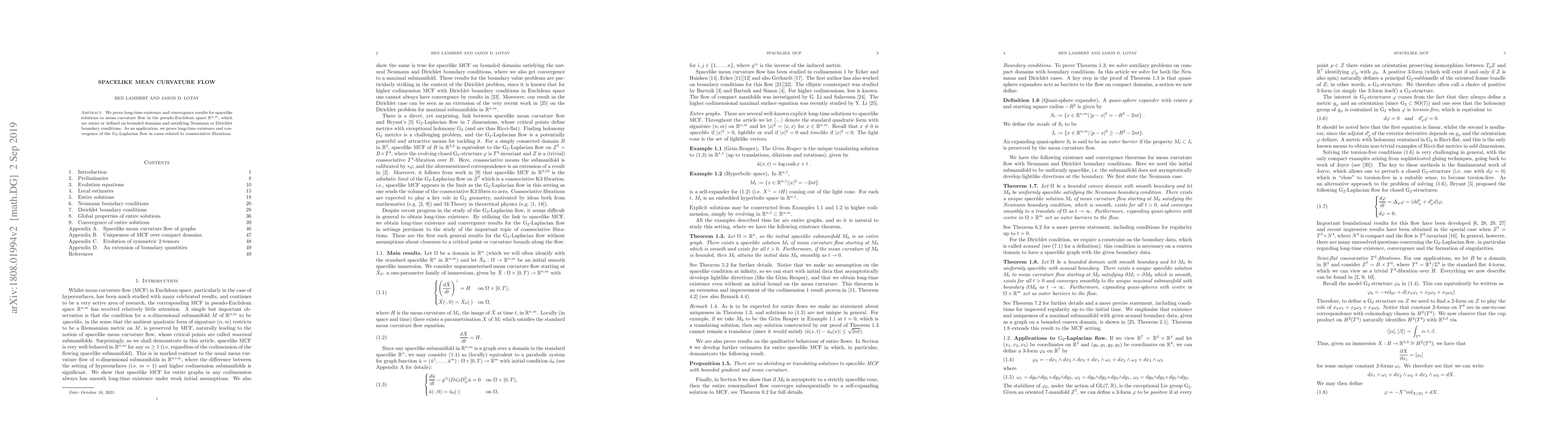 This paper establishes long-time existence and convergence for spacelike mean curvature flow in $\mathbb{R}^{n,m}$, addressing entire or bounded domain solutions with Neumann or Dirichlet conditions. It also demonstrates the long-time existence and convergence of the $\operatorname{G}_2$-Laplacian flow in contexts related to coassociative fibrations.