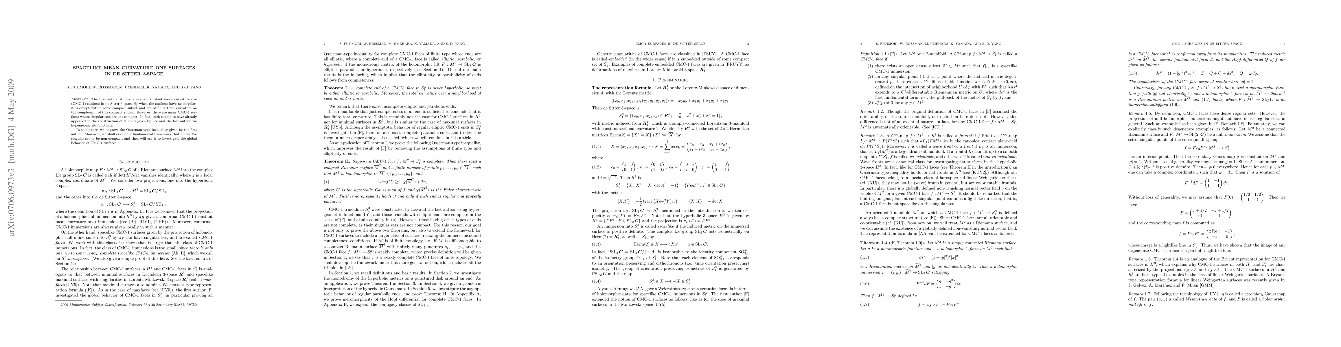 The first author studied spacelike constant mean curvature one (CMC-1) surfaces in de Sitter 3-space when the surfaces have no singularities except within some compact subset and are of finite total curvature on the complement of this compact subset. However, there are many CMC-1 surfaces whose singular sets are not compact. In fact, such examples have already appeared in the construction of trinoids given by Lee and the last author via hypergeometric functions. In this paper, we improve the Osserman-type inequality given by the first author. Moreover, we shall develop a fundamental framework that allows the singular set to be non-compact, and then will use it to investigate the global behavior of CMC-1 surfaces.