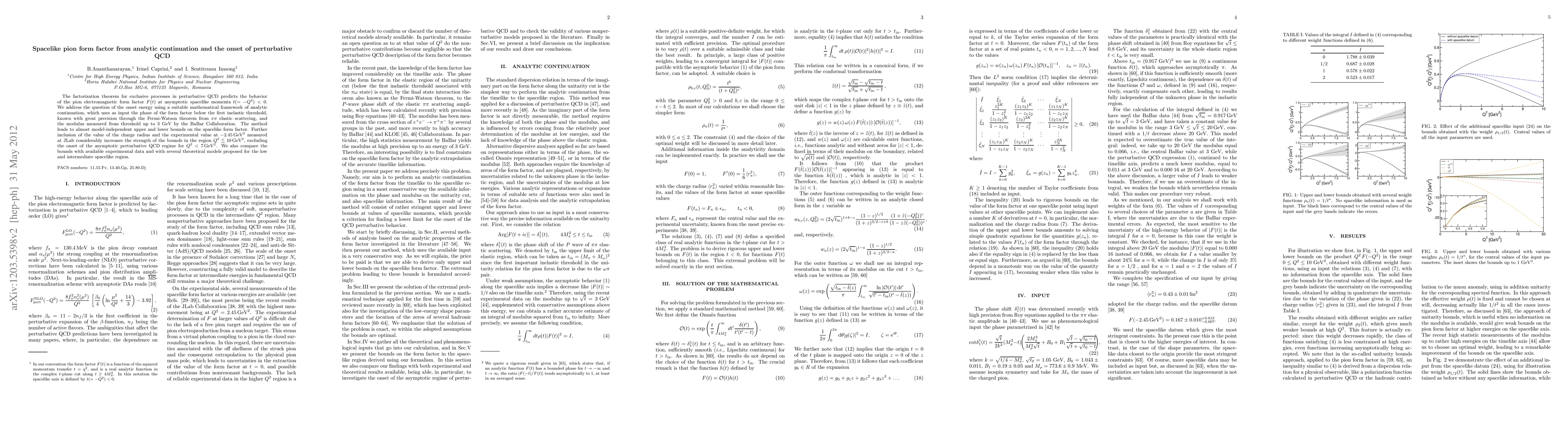 This paper investigates the pion electromagnetic form factor $F(t)$ using analytic continuation to predict its behavior at large spacelike momenta. The study finds that the onset of perturbative QCD is excluded for $Q^2 < 7\gev^2$ by incorporating experimental data and theoretical models, providing strong bounds in the region $Q^2 \lesssim 10\gev^2$.