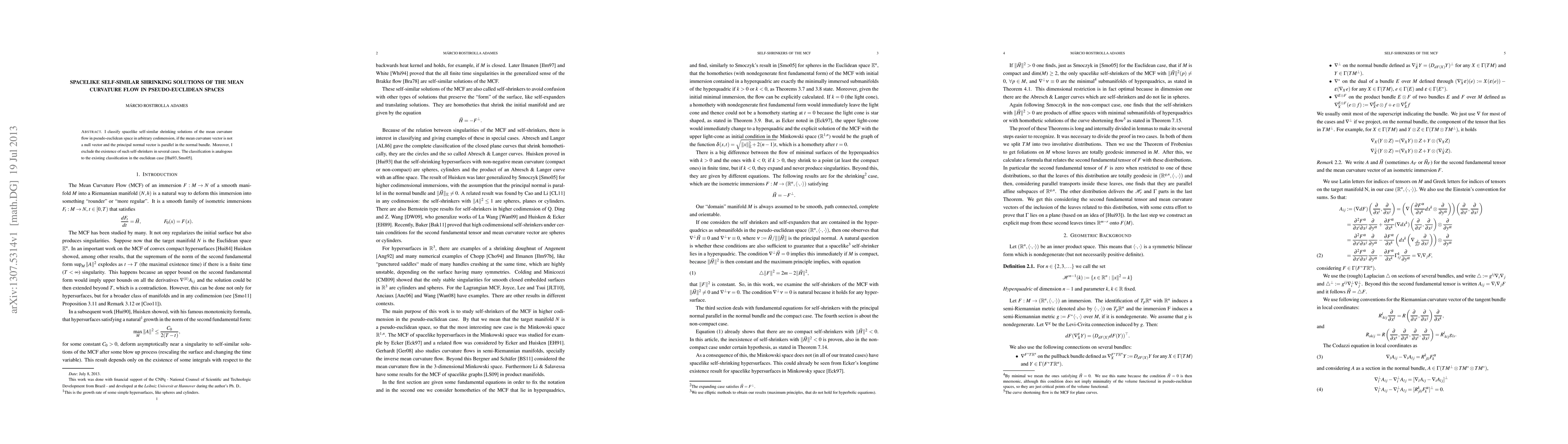 This paper classifies spacelike self-similar shrinking solutions of the mean curvature flow in pseudo-Euclidean spaces, excluding their existence under certain conditions, and parallels the classifications done by Huisken and Smoczyk in Euclidean spaces. The study focuses on scenarios where the mean curvature vector is non-null and the principal normal vector is parallel in the normal bundle.