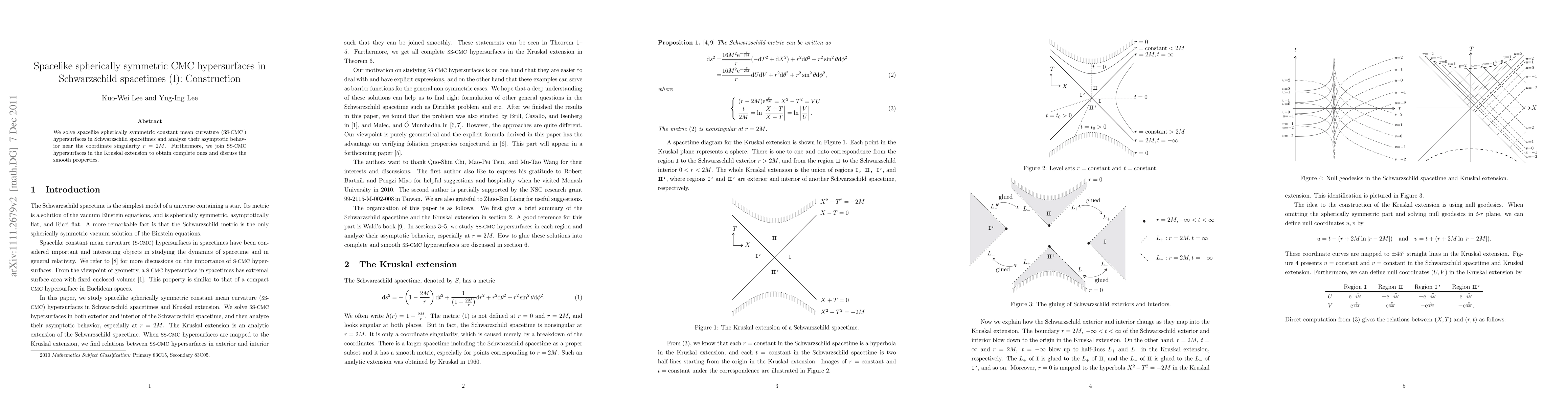This paper constructs spacelike spherically symmetric constant mean curvature (CMC) hypersurfaces in Schwarzschild spacetimes, analyzing their asymptotic behavior near the r = 2M singularity and discussing the smooth properties of complete hypersurfaces joined in the Kruskal extension.