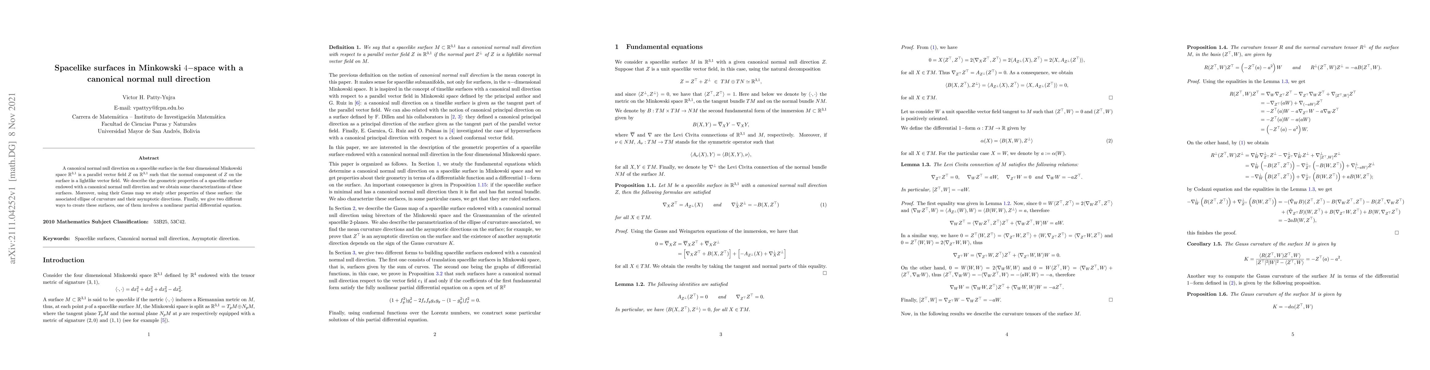 A canonical normal null direction on a spacelike surface in the four dimensional Minkowski space $\mathbb{R}^{3,1}$ is a parallel vector field $Z$ on $\mathbb{R}^{3,1}$ such that the normal component of $Z$ on the surface is a lightlike vector field. We describe the geometric properties of a spacelike surface endowed with a canonical normal null direction and we obtain some characterizations of these surfaces. Moreover, using their Gauss map we study other properties of these surface: the associated ellipse of curvature and their asymptotic directions. Finally, we give two different ways to create these surfaces, one of them involves a nonlinear partial differential equation.