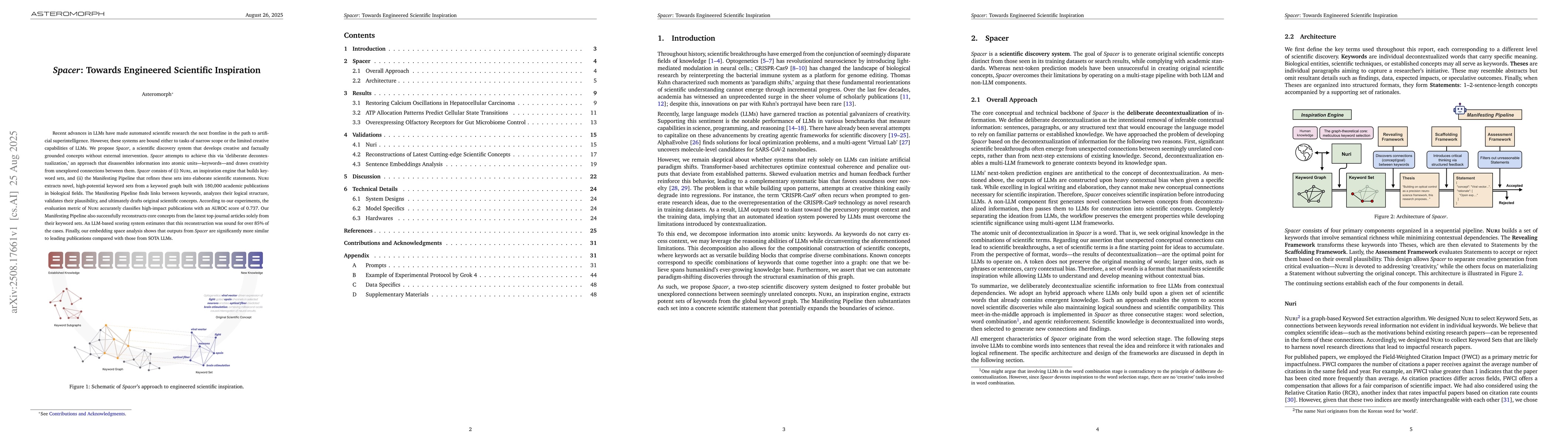 Recent advances in LLMs have made automated scientific research the next frontline in the path to artificial superintelligence. However, these systems are bound either to tasks of narrow scope or the limited creative capabilities of LLMs. We propose Spacer, a scientific discovery system that develops creative and factually grounded concepts without external intervention. Spacer attempts to achieve this via 'deliberate decontextualization,' an approach that disassembles information into atomic units - keywords - and draws creativity from unexplored connections between them. Spacer consists of (i) Nuri, an inspiration engine that builds keyword sets, and (ii) the Manifesting Pipeline that refines these sets into elaborate scientific statements. Nuri extracts novel, high-potential keyword sets from a keyword graph built with 180,000 academic publications in biological fields. The Manifesting Pipeline finds links between keywords, analyzes their logical structure, validates their plausibility, and ultimately drafts original scientific concepts. According to our experiments, the evaluation metric of Nuri accurately classifies high-impact publications with an AUROC score of 0.737. Our Manifesting Pipeline also successfully reconstructs core concepts from the latest top-journal articles solely from their keyword sets. An LLM-based scoring system estimates that this reconstruction was sound for over 85% of the cases. Finally, our embedding space analysis shows that outputs from Spacer are significantly more similar to leading publications compared with those from SOTA LLMs.