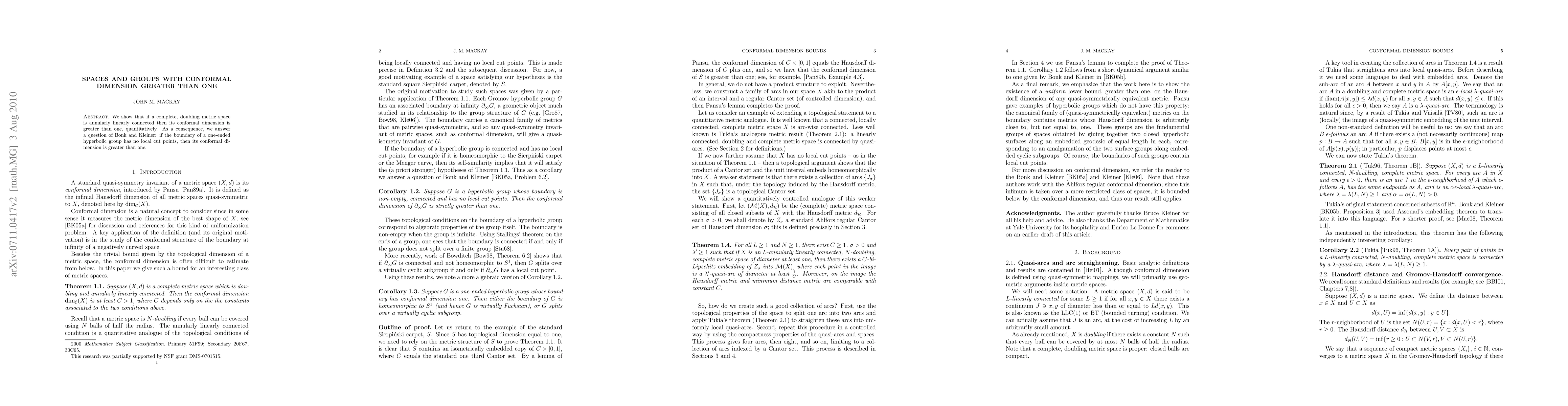 Researchers prove that a complete, doubling metric space with certain connectivity properties has a conformal dimension greater than one. This resolves a question of Bonk and Kleiner about hyperbolic groups.