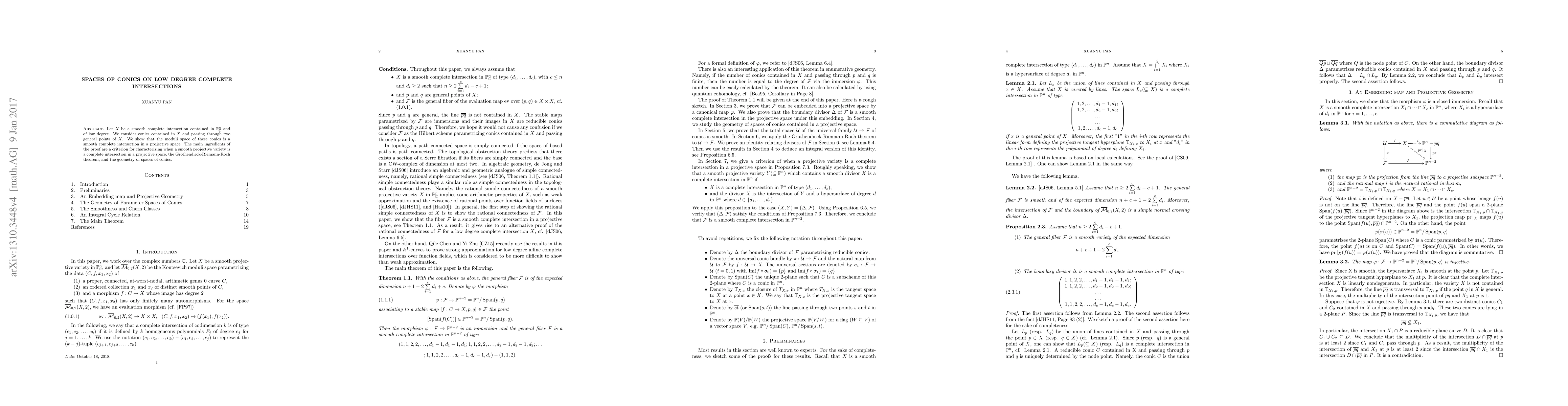 This paper investigates the moduli space of conics on smooth complete intersections passing through two general points, demonstrating it is a smooth complete intersection, using criteria for complete intersections, the Grothendieck-Riemann-Roch theorem, and the geometry of conic spaces.