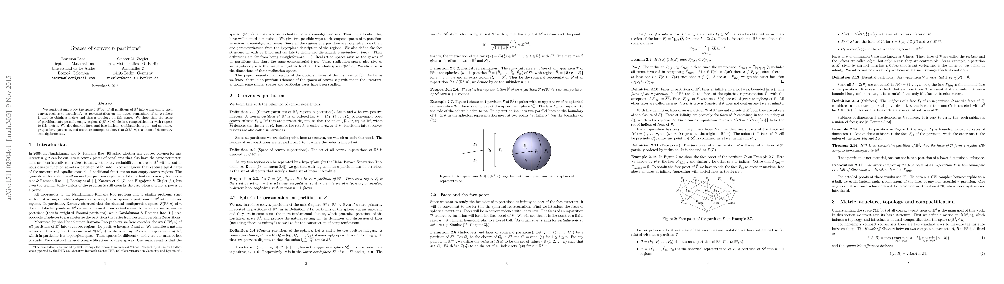 Researchers created a space of convex n-partitions in d-dimensional space, describing its structure using geometric concepts like spheres, faces, and adjacency graphs. They also showed that this space can be compactified into a union of elementary semialgebraic sets.