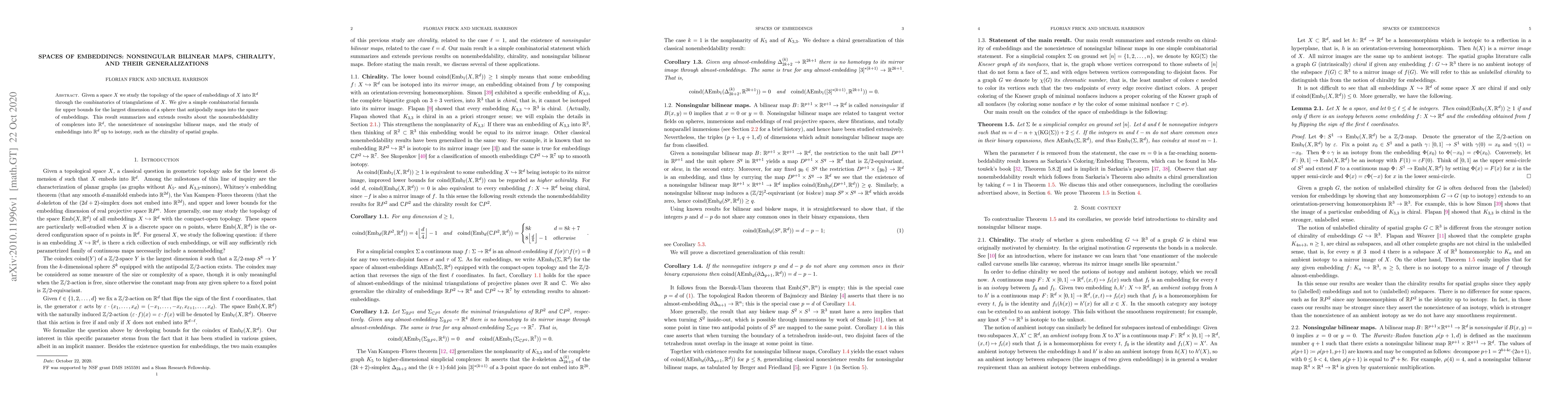 Given a space X we study the topology of the space of embeddings of X into $\mathbb{R}^d$ through the combinatorics of triangulations of X. We give a simple combinatorial formula for upper bounds for the largest dimension of a sphere that antipodally maps into the space of embeddings. This result summarizes and extends results about the nonembeddability of complexes into $\mathbb{R}^d$, the nonexistence of nonsingular bilinear maps, and the study of embeddings into $\mathbb{R}^d$ up to isotopy, such as the chirality of spatial graphs.