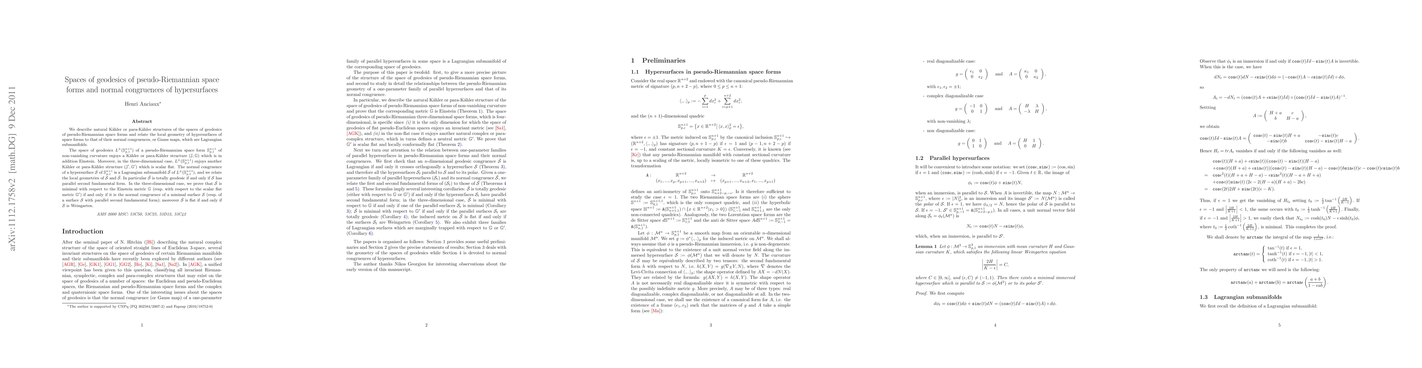 This paper investigates the Kähler or para-Kähler structures on the space of geodesics of pseudo-Riemannian space forms, showing they are Einstein or scalar flat. It also relates the local geometry of hypersurfaces in these space forms to their normal congruences, proving minimality conditions for these congruences based on the hypersurfaces' geometric properties.