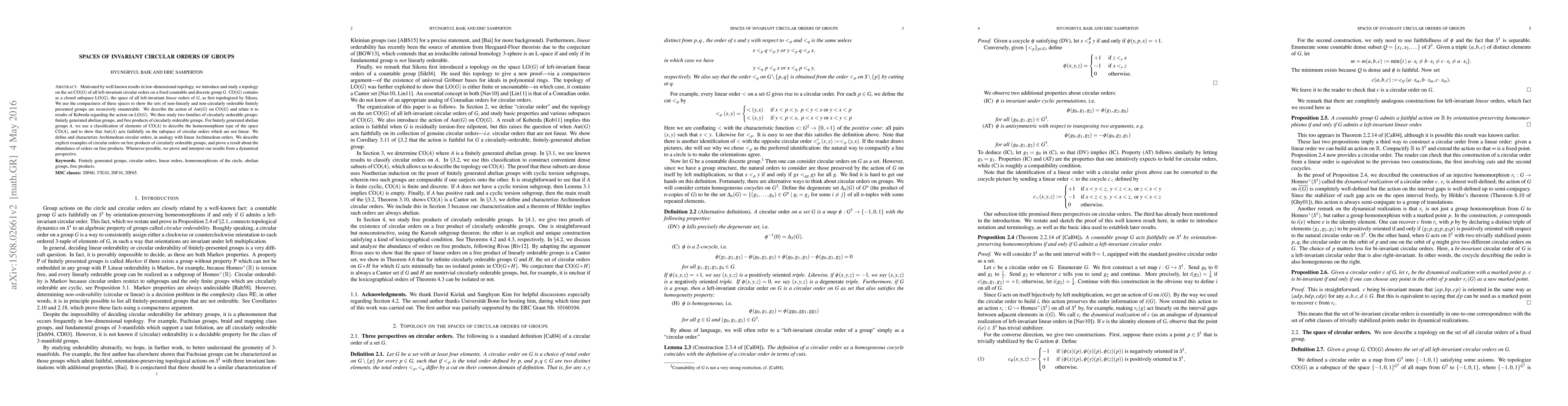 This paper introduces a topology on the set of left-invariant circular orders on a countable discrete group G, exploring their recursive enumerability and the action of the group's automorphisms. It also classifies circular orders for finitely generated abelian groups and examines free products of circularly orderable groups, providing dynamical interpretations of these results.