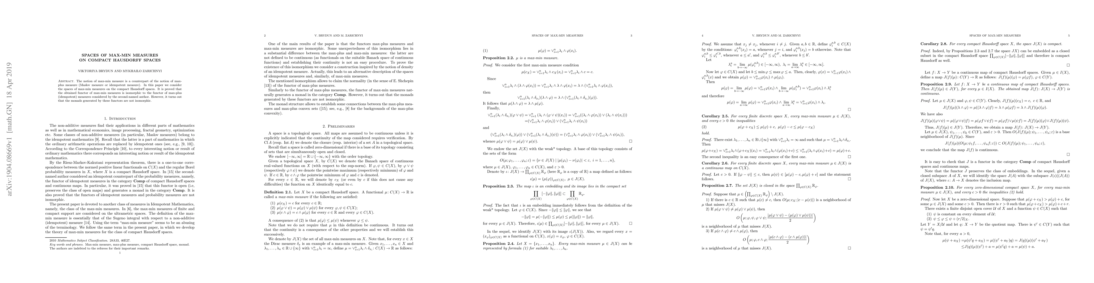 The paper studies max-min measures on compact Hausdorff spaces, proving their functor is isomorphic to that of max-plus measures, though the monads generated by these functors differ.