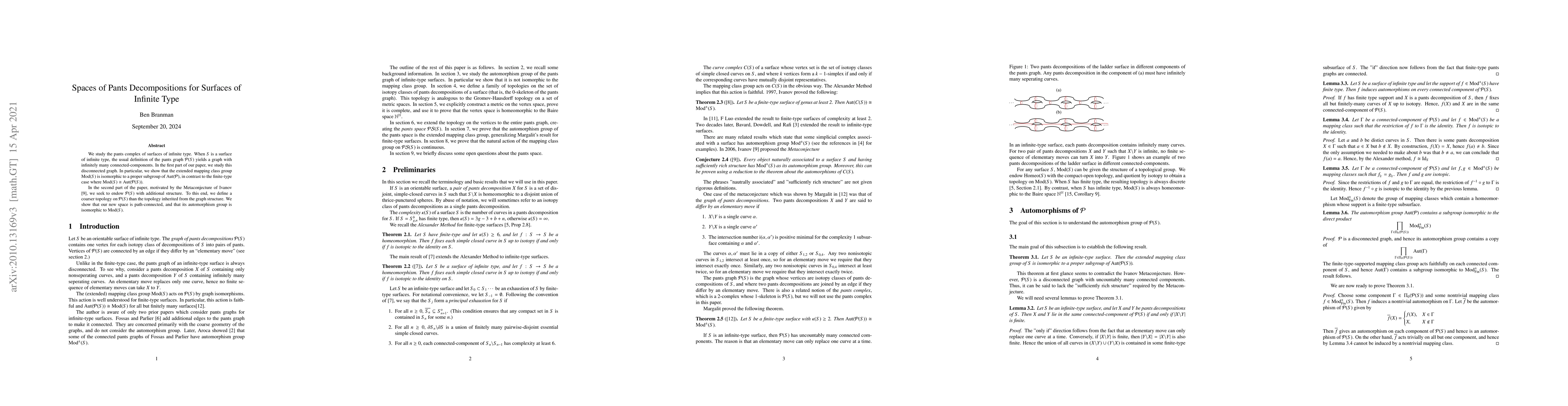 We study the pants complex of surfaces of infinite type. When $S$ is a surface of infinite type, the usual definition of the pants graph $\mathcal{P}(S)$ yields a graph with infinitely many connected-components. In the first part of our paper, we study this disconnected graph. In particular, we show that the extended mapping class group $\mathrm{Mod}(S)$ is isomorphic to a proper subgroup of $\mathrm{Aut}(\mathcal{P})$, in contrast to the finite-type case where $\mathrm{Mod}(S)\cong \mathrm{Aut}(\mathcal{P}(S))$. In the second part of the paper, motivated by the Metaconjecture of Ivanov, we seek to endow $\mathcal{P}(S)$ with additional structure. To this end, we define a coarser topology on $\mathcal{P}(S)$ than the topology inherited from the graph structure. We show that our new space is path-connected, and that its automorphism group is isomorphic to $\mathrm{Mod}(S)$.