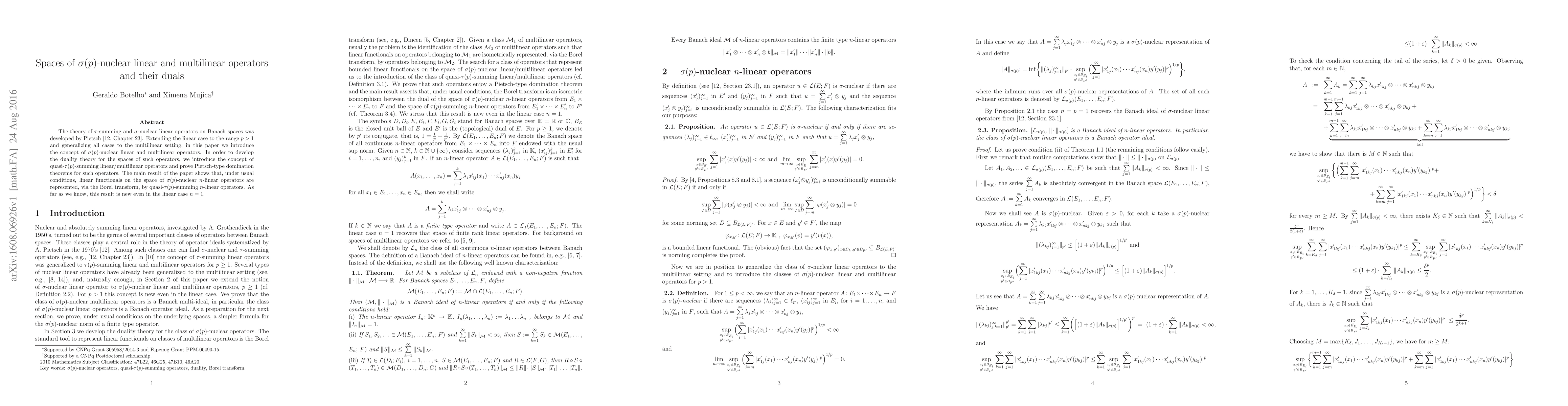 The theory of $\tau$-summing and $\sigma$-nuclear linear operators on Banach spaces was developed by Pietsch [12, Chapter 23]. Extending the linear case to the range p > 1 and generalizing all cases to the multilinear setting, in this paper we introduce the concept of $\sigma(p)$-nuclear linear and multilinear operators. In order to develop the duality theory for the spaces of such operators, we introduce the concept of quasi-tau(p)-summing linear/multilinear operators and prove Pietsch-type domination theorems for such operators. The main result of the paper shows that, under usual conditions, linear functionals on the space of $\sigma(p)$-nuclear $n$-linear operators are represented, via the Borel transform, by quasi-$\tau(p)$-summing $n$-linear operators. As far as we know, this result is new even in the linear case $n = 1$.