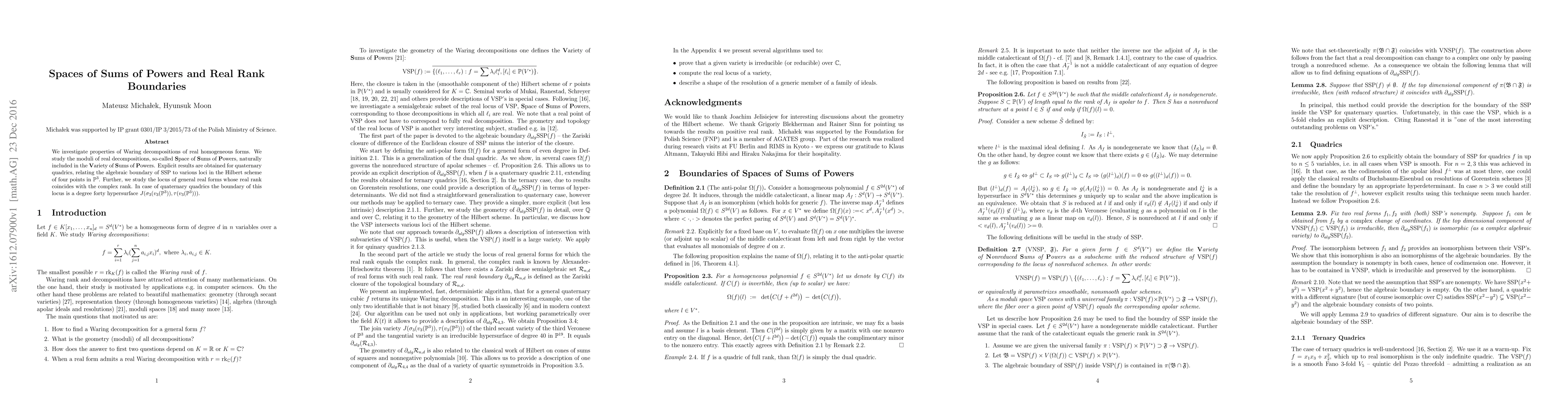 We investigate properties of Waring decompositions of real homogeneous forms. We study the moduli of real decompositions, so-called Space of Sums of Powers, naturally included in the Variety of Sums of Powers. Explicit results are obtained for quaternary quadrics, relating the algebraic boundary of ${\rm SSP}$ to various loci in the Hilbert scheme of four points in $\mathbb{P}^3$. Further, we study the locus of general real forms whose real rank coincides with the complex rank. In case of quaternary quadrics the boundary of this locus is a degree forty hypersurface $J(\sigma_3(v_3(\mathbb{P}^3)),\tau(v_3(\mathbb{P}^3)))$.