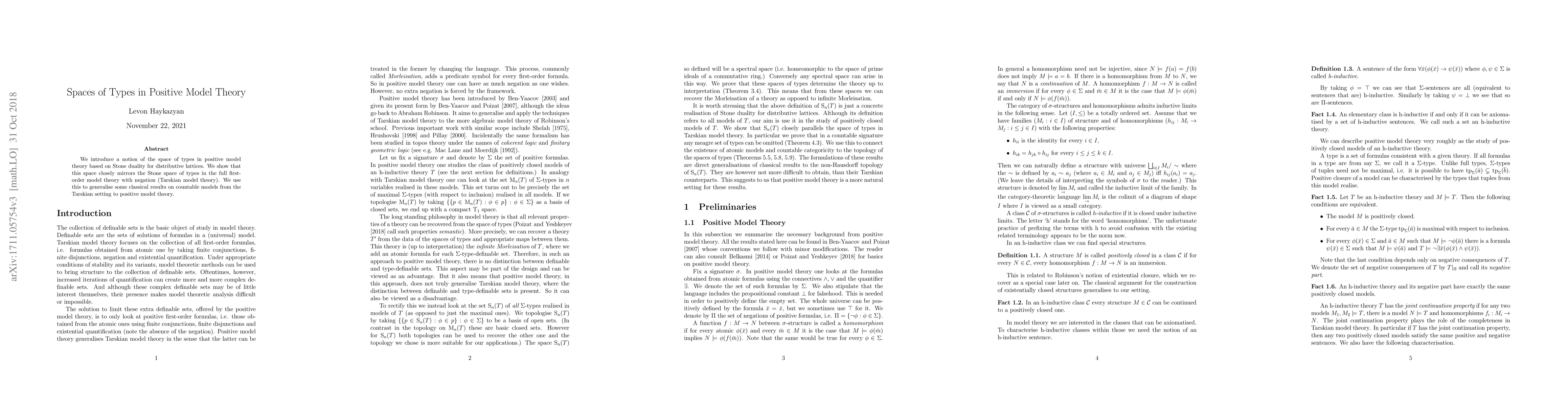 We introduce a notion of the space of types in positive model theory based on Stone duality for distributive lattices. We show that this space closely mirrors the Stone space of types in the full first-order model theory with negation (Tarskian model theory). We use this to generalise some classical results on countable models from the Tarskian setting to positive model theory.
