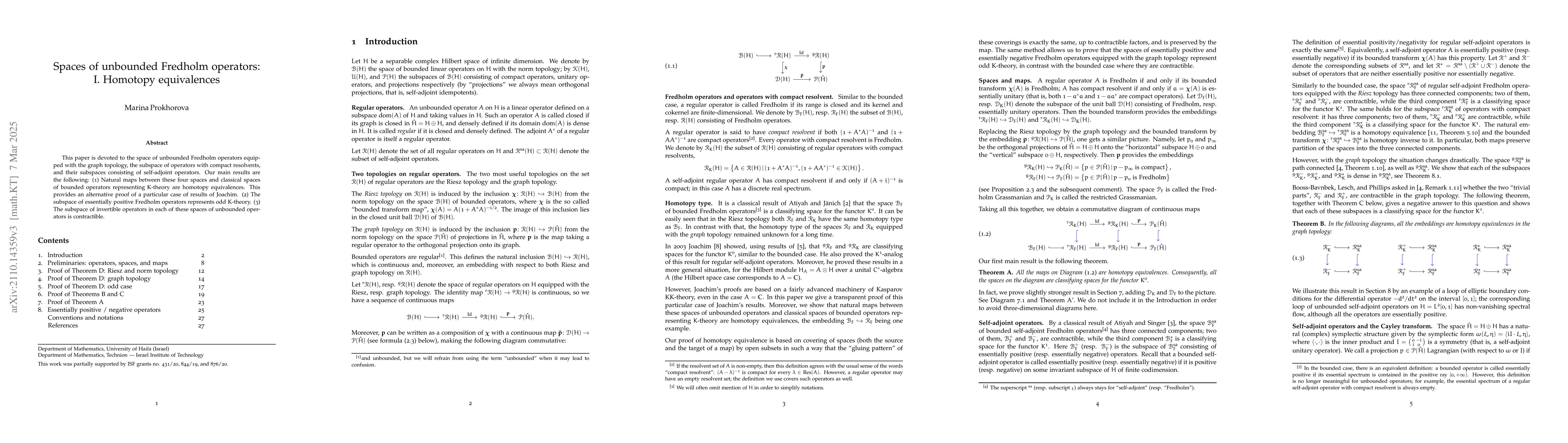 This paper examines the homotopy equivalences between the space of unbounded Fredholm operators and classical spaces of bounded operators, proving they represent K-theory. It also shows that the subspace of unbounded essentially positive Fredholm operators represents odd K-theory and that the invertible subspaces in these spaces are contractible.