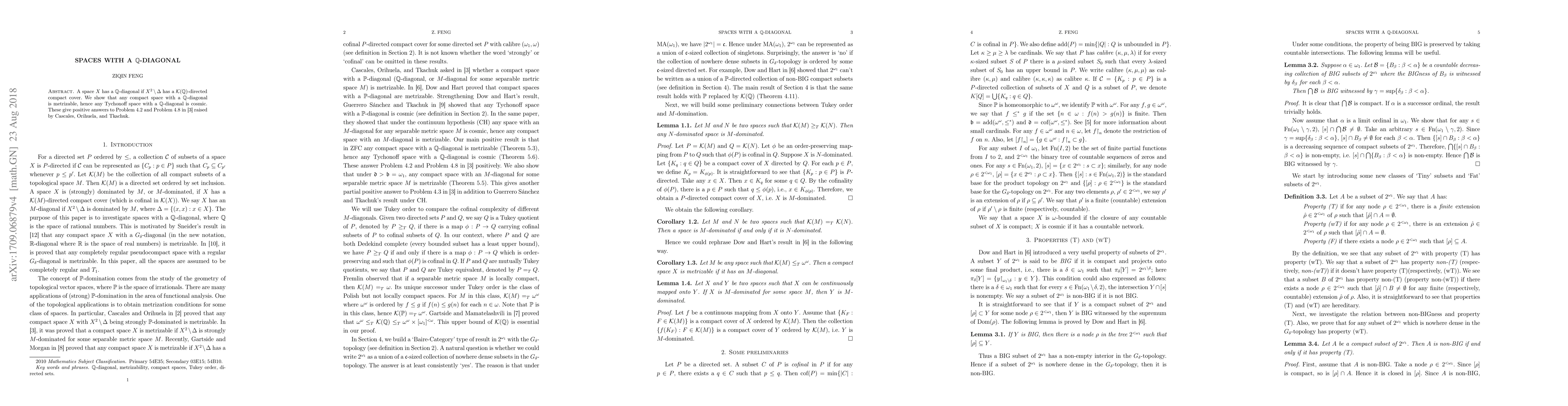 This paper demonstrates that any compact space with a $\mathbb{Q}$-diagonal is metrizable, and consequently, any Tychonorff space with a $\mathbb{Q}$-diagonal is cosmic, answering two specific problems posed in \cite{COT11}.