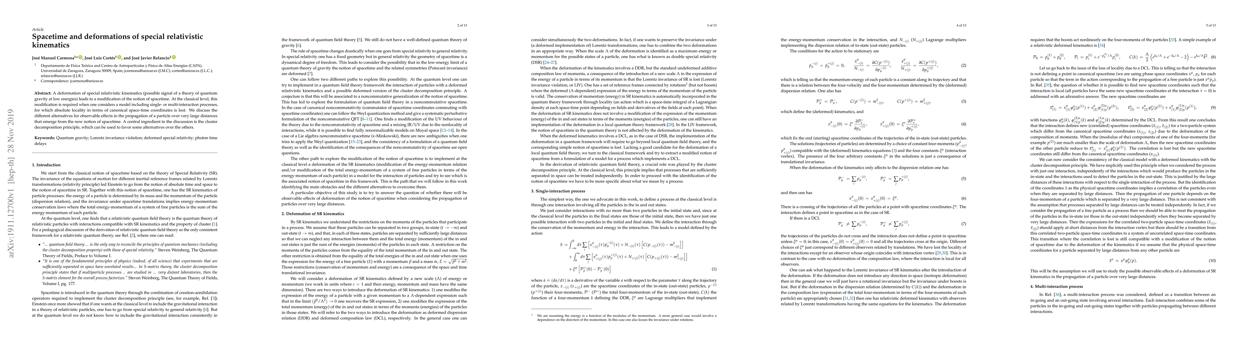 A deformation of special relativistic kinematics (possible signal of a theory of quantum gravity at low energies) leads to a modification of the notion of spacetime. At the classical level, this modification is required when one considers a model including single- or multi-interaction processes, for which absolute locality in terms of canonical space-time coordinates is lost. We discuss the different alternatives for observable effects in the propagation of a particle over very large distances that emerge from the new notion of spacetime. A central ingredient in the discussion is the cluster decomposition principle, which can be used to favor some alternatives over the others.
