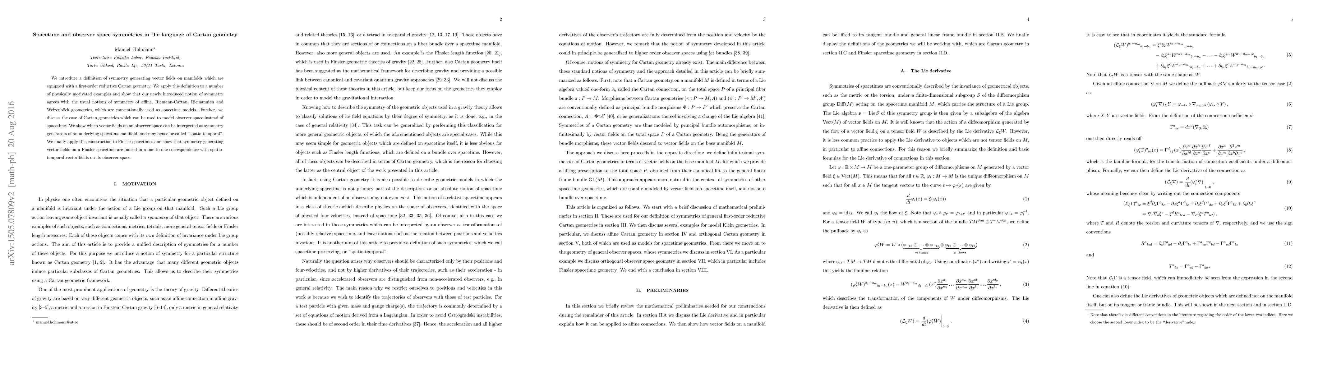 This paper defines symmetry generating vector fields on manifolds with Cartan geometry and applies this to various spacetime models, showing consistency with existing notions. It also explores symmetries in observer space and demonstrates a one-to-one correspondence between symmetry generating vector fields in Finsler spacetimes and spatio-temporal vector fields in their observer space.