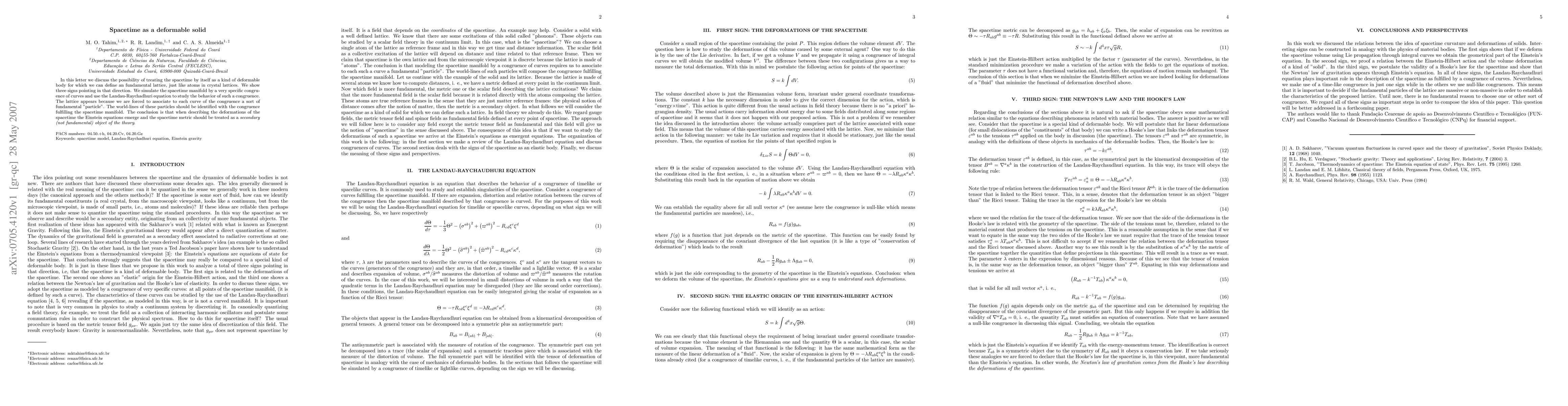 In this letter we discuss the possibility of treating the spacetime by itself as a kind of deformable body for which we can define an fundamental lattice, just like atoms in crystal lattices. We show three signs pointing in that direction. We simulate the spacetime manifold by a very specific congruence of curves and use the Landau-Raychadhuri equation to study the behavior of such a congruence. The lattice appears because we are forced to associate to each curve of the congruence a sort of fundamental "particle". The world-lines of these particles should be identified with the congruence fulfilling the spacetime manifold. The conclusion is that when describing the deformations of the spacetime the Einstein equations emerge and the spacetime metric should be treated as a secondary (not fundamental) object of the theory.