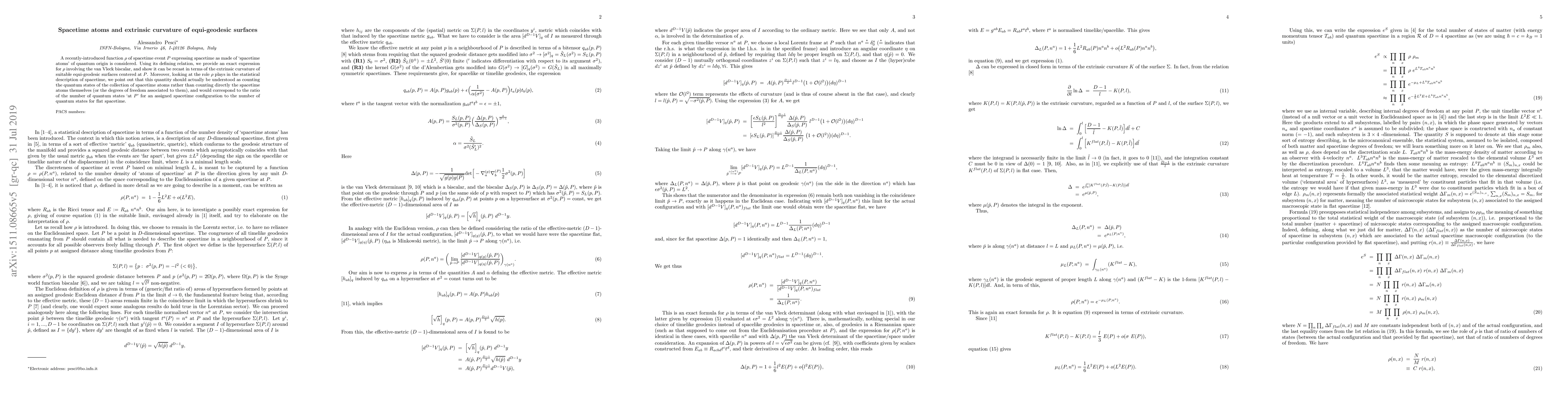 This paper introduces a function $\rho$ representing spacetime as composed of quantum 'spacetime atoms' and derives an exact expression for $\rho$ in terms of the van Vleck biscalar and the extrinsic curvature of equi-geodesic surfaces. It argues that $\rho$ should be interpreted as the ratio of quantum states in a given spacetime configuration to those in flat spacetime.