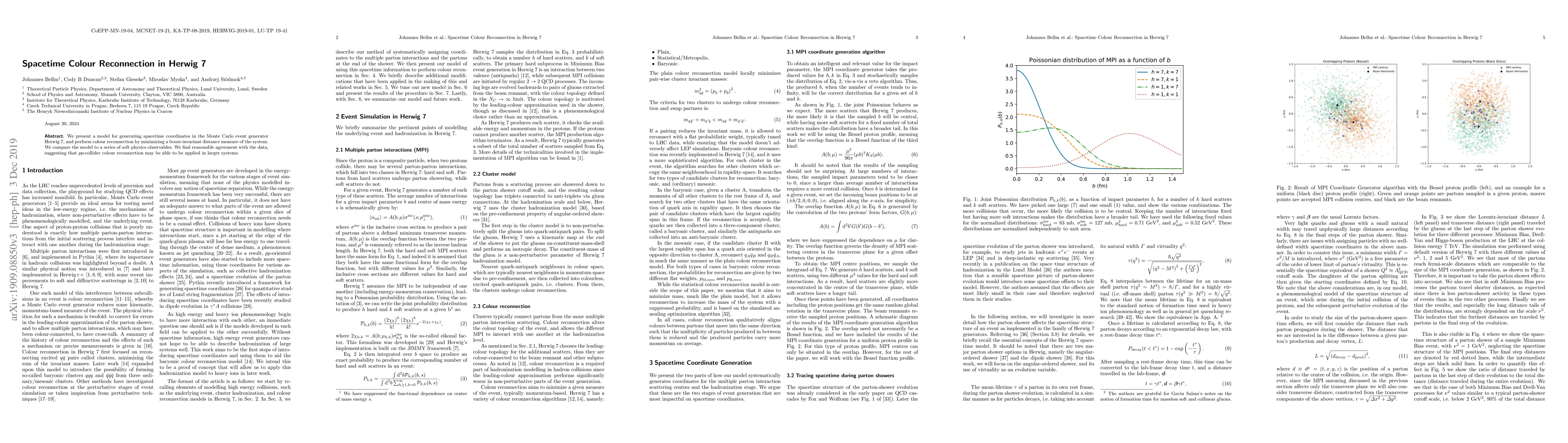 We present a model for generating spacetime coordinates in the Monte Carlo event generator Herwig 7, and perform colour reconnection by minimizing a boost-invariant distance measure of the system. We compare the model to a series of soft physics observables. We find reasonable agreement with the data, suggesting that $pp$-collider colour reconnection may be able to be applied in larger systems.