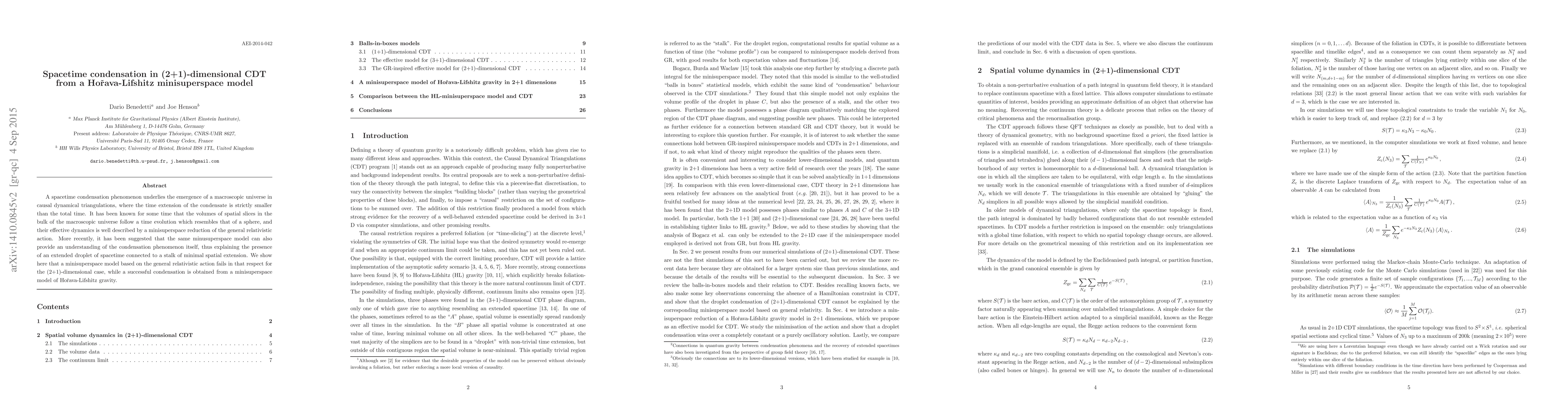 A spacetime condensation phenomenon underlies the emergence of a macroscopic universe in causal dynamical triangulations, where the time extension of the condensate is strictly smaller than the total time. It has been known for some time that the volumes of spatial slices in the bulk of the macroscopic universe follow a time evolution which resembles that of a sphere, and their effective dynamics is well described by a minisuperspace reduction of the general relativistic action. More recently, it has been suggested that the same minusuperspace model can also provide an understanding of the condensation phenomenon itself, thus explaining the presence of an extended droplet of spacetime connected to a stalk of minimal spatial extension. We show here that a minisuperspace model based on the general relativistic action fails in that respect for the (2+1)-dimensional case, while a successful condensation is obtained from a minisuperspace model of Horava-Lifshitz gravity.