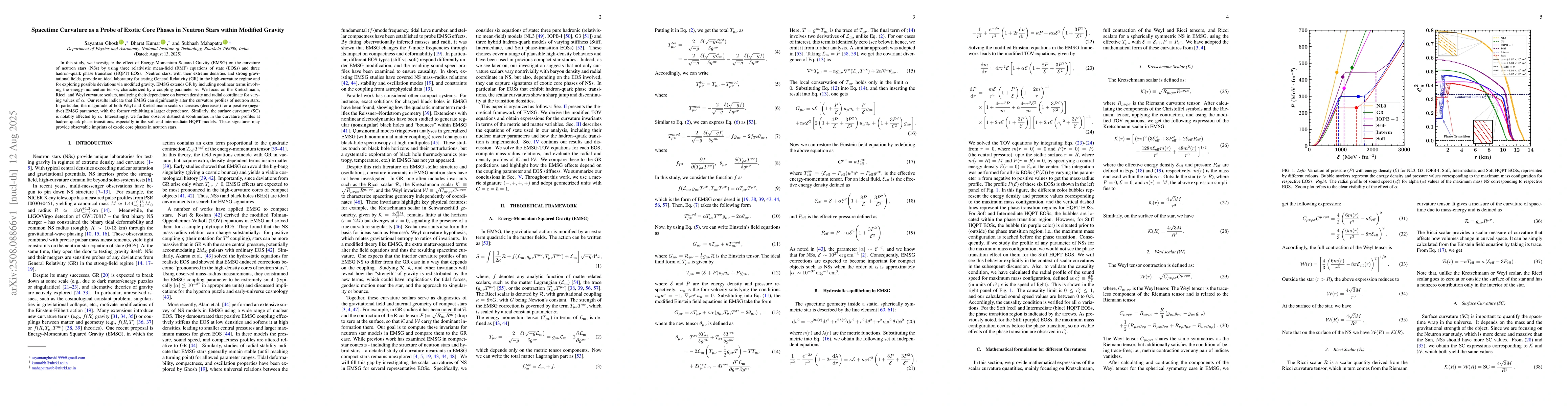 In this study, we investigate the effect of Energy-Momentum Squared Gravity (EMSG) on the curvature of neutron stars (NSs) by using three relativistic mean-field (RMF) equations of state (EOSs) and three hadron-quark phase transition (HQPT) EOSs. Neutron stars, with their extreme densities and strong gravitational fields, provide an ideal laboratory for testing General Relativity (GR) in the high-curvature regime and for exploring possible deviations via modified gravity. EMSG extends GR by including nonlinear terms involving the energy-momentum tensor, characterized by a coupling parameter $\alpha$. We focus on the Kretschmann, Ricci, and Weyl curvature scalars, analyzing their dependence on baryon density and radial coordinate for varying values of $\alpha$. Our results indicate that EMSG can significantly alter the curvature profiles of neutron stars. In particular, the magnitude of both Weyl and Kretschmann scalars increases (decreases) for a positive (negative) EMSG parameter, with the former exhibiting a larger dependence. Similarly, the surface curvature (SC) is notably affected by $\alpha$. Interestingly, we further observe distinct discontinuities in the curvature profiles at hadron-quark phase transitions, especially in the soft and intermediate HQPT models. These signatures may provide observable imprints of exotic core phases in neutron stars.