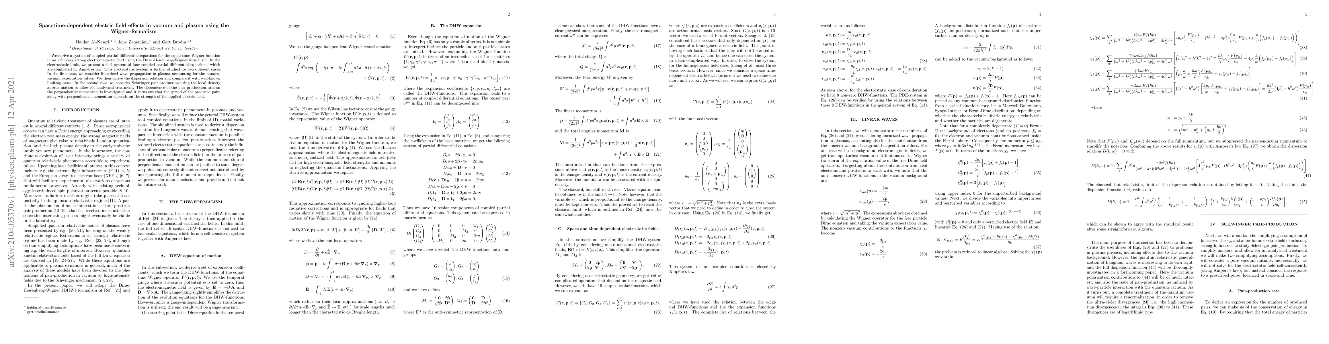 We derive a system of coupled partial differential equations for the equal-time Wigner function in an arbitrary strong electromagnetic field using the Dirac-Heisenberg-Wigner formalism. In the electrostatic limit, we present a 3+1-system of four coupled partial differential equations, which are completed by Ampere's law. This electrostatic system is further studied for two different cases. In the first case, we consider linearized wave propagation in plasma accounting for the nonzero vacuum expectation values. We then derive the dispersion relation and compare it with well-known limiting cases. In the second case, we consider Schwinger pair production using the local density approximation to allow for analytical treatment. The dependence of the pair production rate on the perpendicular momentum is investigated and it turns out that the spread of the produced pairs along with perpendicular momentum depends on the strength of the applied electric field.