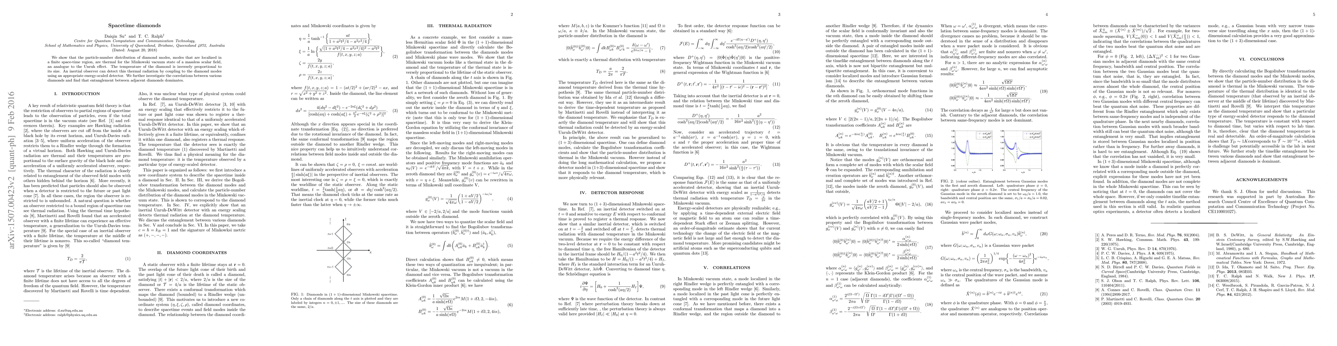 The paper demonstrates that diamond modes, localized in finite spacetime regions, exhibit thermal particle-number distributions analogous to the Unruh effect for the Minkowski vacuum state. The temperature of these diamonds is inversely proportional to their size, and inertial observers can detect this thermal radiation via appropriately scaled detectors.