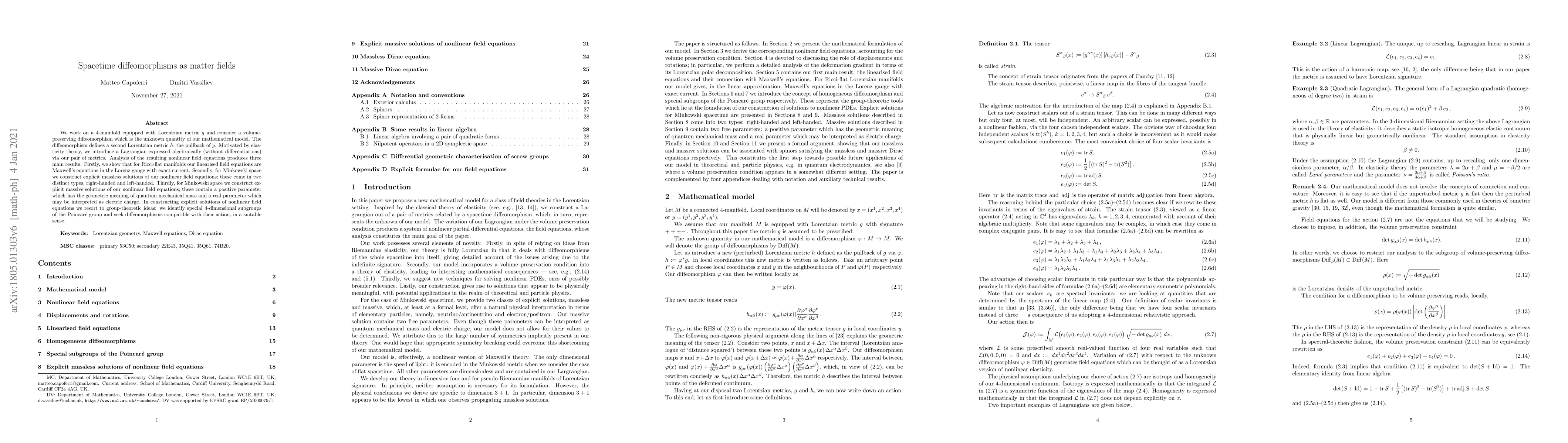 We work on a 4-manifold equipped with Lorentzian metric $g$ and consider a volume-preserving diffeomorphism which is the unknown quantity of our mathematical model. The diffeomorphism defines a second Lorentzian metric $h$, the pullback of $g$. Motivated by elasticity theory, we introduce a Lagrangian expressed algebraically (without differentiations) via our pair of metrics. Analysis of the resulting nonlinear field equations produces three main results. Firstly, we show that for Ricci-flat manifolds our linearised field equations are Maxwell's equations in the Lorenz gauge with exact current. Secondly, for Minkowski space we construct explicit massless solutions of our nonlinear field equations; these come in two distinct types, right-handed and left-handed. Thirdly, for Minkowski space we construct explicit massive solutions of our nonlinear field equations; these contain a positive parameter which has the geometric meaning of quantum mechanical mass and a real parameter which may be interpreted as electric charge. In constructing explicit solutions of nonlinear field equations we resort to group-theoretic ideas: we identify special 4-dimensional subgroups of the Poincare group and seek diffeomorphisms compatible with their action, in a suitable sense.